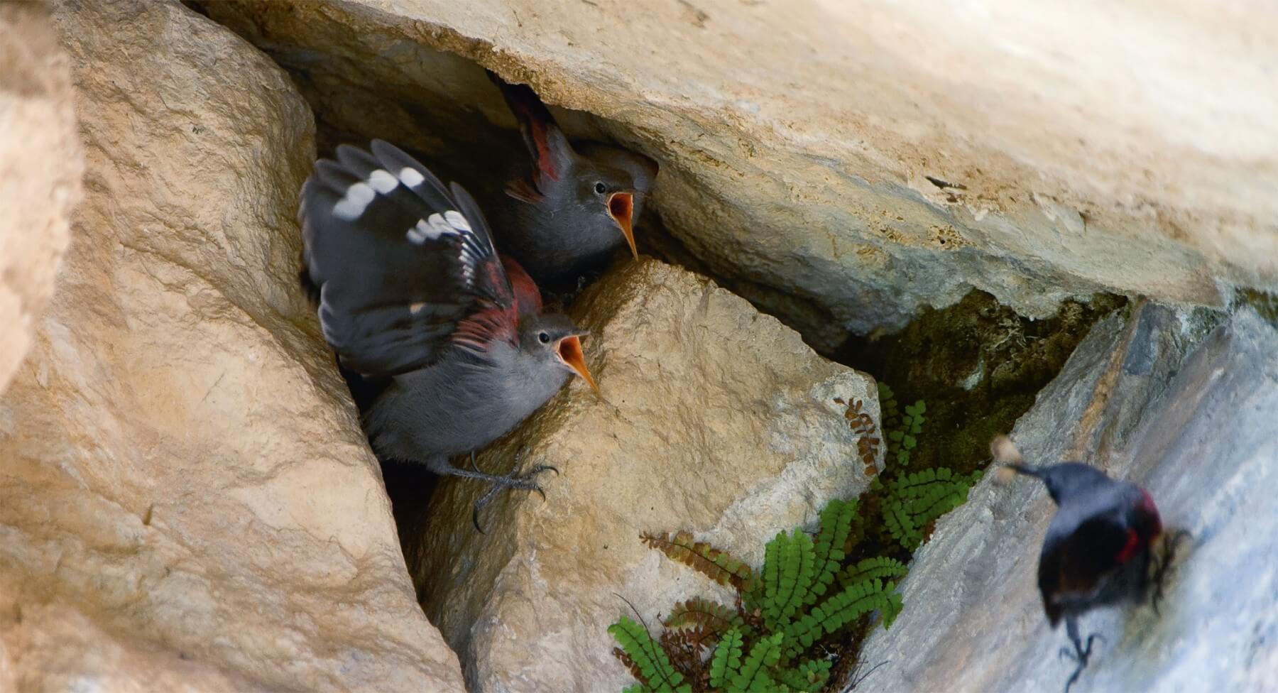 6 h 30 Premier chant des rougequeues sur fond de torrent. Un oiseau arrive d'un vol d'abord direct puis se pose en papillonnant sur un rocher. Ailes rouge, noir et blanc agitées de tics nerveux. Dos gris. Bec chargé d'une brochette de sept proies. Le tichodrome frémit sur la pierre puis grimpe en quelques sauts jusqu'à la cavité. « C'est le mâle avec sa bavette noire. Ici, à partir du moment où la femelle a pondu, il n'est plus rentré dans le nid et a toujours ravitaillé la couveuse à l'extérieur. C'est ce qu'on appelle joliment les offrandes. » Depuis hier, changement complet de comportement. Frank l'a vu rentrer pour aider à évacuer les sacs fécaux. Puis il est revenu régulièrement à l'intérieur pour donner leurs premières becquées aux nouveaux-nés.