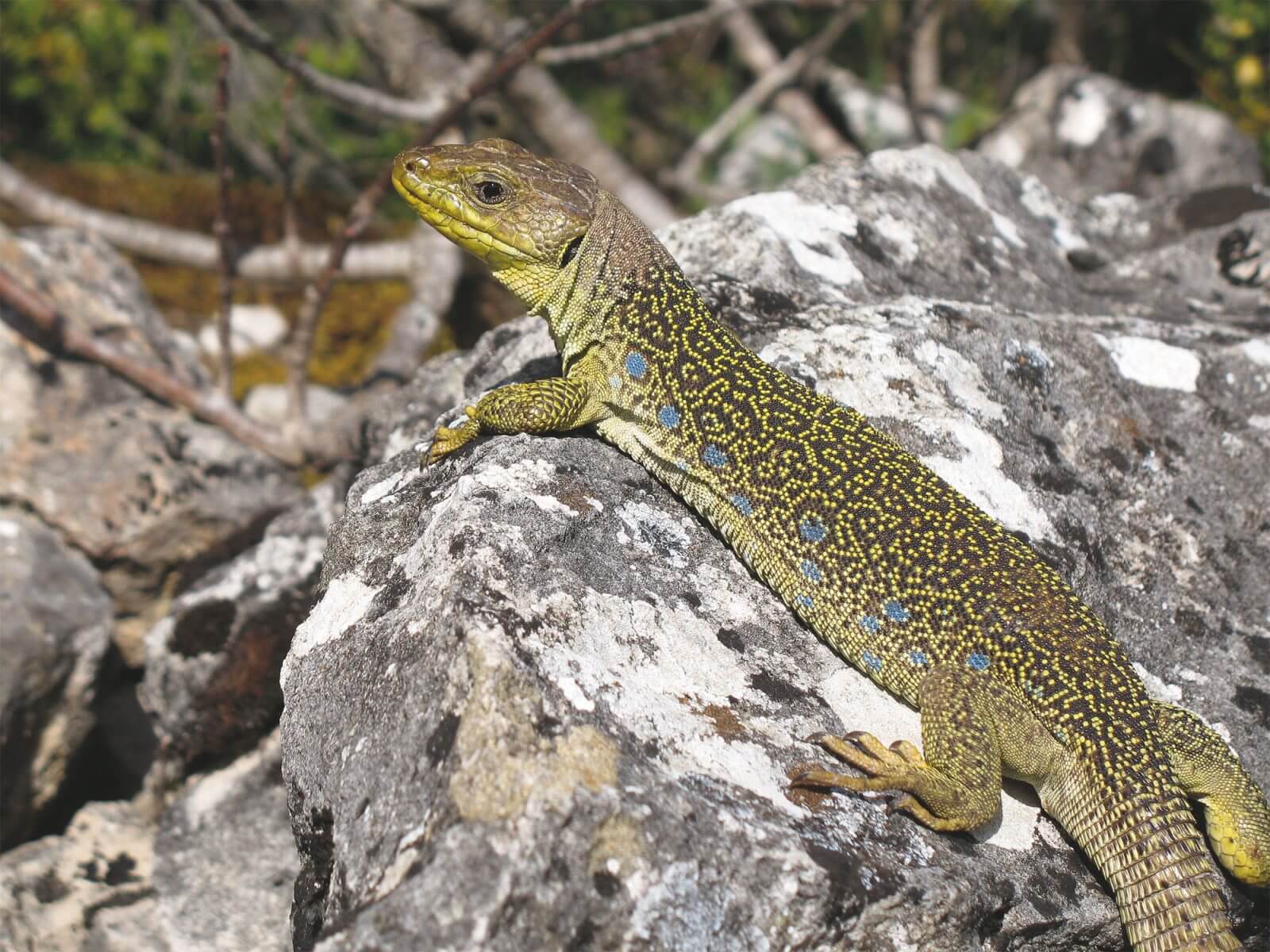Ici, point de lézard des murailles : celui-là préfère aux proies maigrelettes du plateau de l’Auverne les mouches bien grasses des villages de plaine. Le lézard hispanique joue moins les fines bouches. Efflanqué mais vif comme l’éclair, il est à l’affût des araignées et des moucherons qui s’aventurent sur la caillasse. Le lézard ocellé, superbe reptile vert à taches bleues, empiète parfois sur son territoire, mais il ne s’y attarde guère : les criquets et les gros coléoptères dont il raffole sont plus nombreux entre les herbes basses et odorantes de la garrigue.