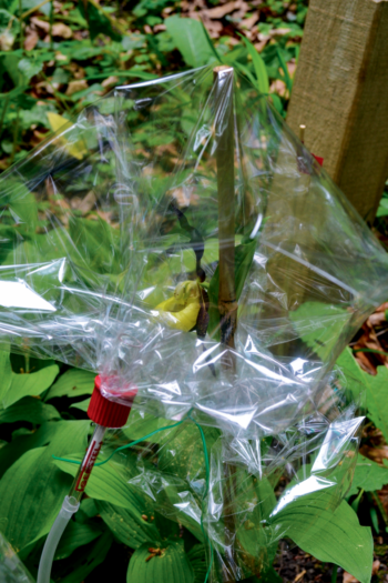 Alors, où est le nectar espéré ? Quelques tours sur soi et l’évidence saute aux yeux : la loge lisse n’est qu’une belle arnaque. Il faut sortir du piège ! Mais avec l’ouverture qui forme un ourlet vers l’intérieur, l’insecte ne parvient pas à voler droit pour sortir. Il finit par traverser le labelle par un étroit tunnel à l’arrière, guidé par des zones translucides. Au passage, les pollinies effleurées lui collent une masse de pollen sur le dos. Afin de connaître les victimes de cette vaste tromperie, Olivia Rusconi a piégé les insectes volants dans le secteur à l’aide d’assiettes jaunes imitant la fleur, ainsi qu’en fermant la sortie des sabots avec un ruban : « La plupart sont des abeilles solitaires, dont quatre ont été découvertes pour la première fois en Suisse, ainsi qu’un syrphe ». Parmi cette large gamme d’insectes, peu sont en réalité adaptés. Trop petits, ils s’en sortent sans toucher au pollen. Trop gros, ils sont piégés sans jamais parvenir à sortir. De la bonne taille, il faut qu’ils se fassent à nouveau piéger afin de déposer le pollen sur une autre fleur. « En fait, le sabot de Vénus se fait polliniser une fois tous les tremblements de terre. Ce n’est pas une espèce hyper compétitive, constate Olivia. Parce que les insectes ne sont pas longtemps dupes. Ils se font avoir une fois, deux fois, et après ils disent : “ C’est sympa les gars, mais on ne va pas revenir.” »