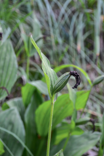 Nous sortons des sentiers battus pour escalader une prairie maigre où se dressent des orchis moucherons et de jeunes épicéas scintillants de gouttelettes. Un pouillot véloce compte ses écus, l’averse est terminée. Le sol pentu s’est mué en toboggan. Quelle ironie d’avoir chaussé mes sandales de marche pour chercher des sabots… « Cette espèce s’implante souvent dans des terrains accidentés comme les éboulis ou les zones riveraines perturbées, témoigne Olivia Rusconi. Mais avec le temps, elle semble avoir besoin d’un milieu forestier ouvert plus stable. Cet habitat a tendance à disparaître avec la fermeture des forêts. ».