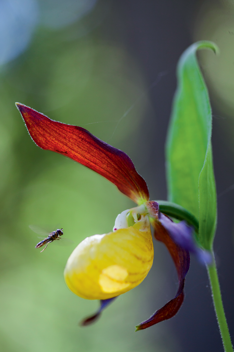« Elle attire les insectes pollinisateurs par la couleur jaune de son grand labelle et par son parfum, explique ma guide. J’ai emballé des fleurs dans des sachets de four à cuisson, puis pompé les molécules odorantes qui se sont accumulées pour les analyser. Le cocktail qui contient du linalol et de l’acétate d’octyle donne probablement l’illusion d’un nectar appétissant. » Oui, car la fleur n’offre en réalité pas de récompense sucrée aux insectes. Suivons une abeille sauvage qui s’engouffre avidement dans un sabot.