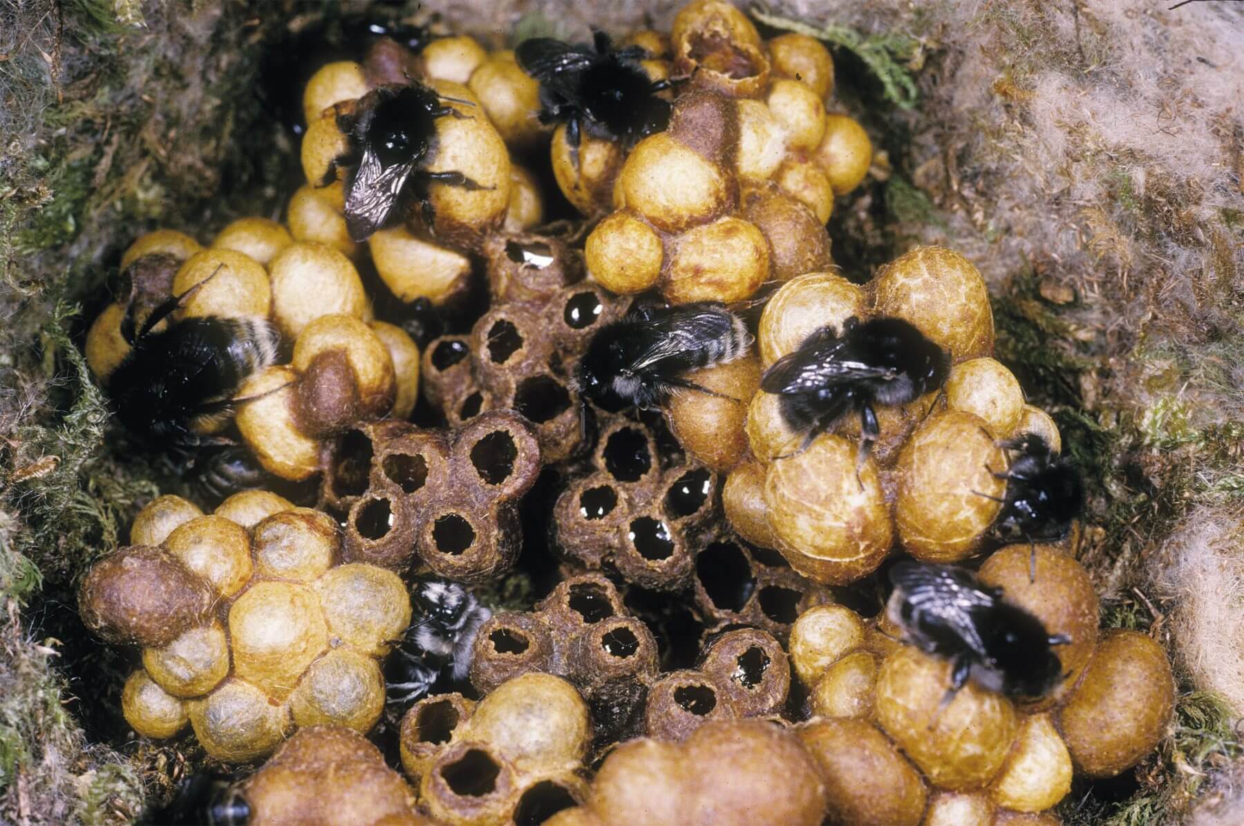 Dans certains cas, plusieurs abeilles collaborent pour construire un nid commun où elles déposent chacune leur progéniture. Ce pas de plus vers la vie sociale améliore la sécurité du couvain.