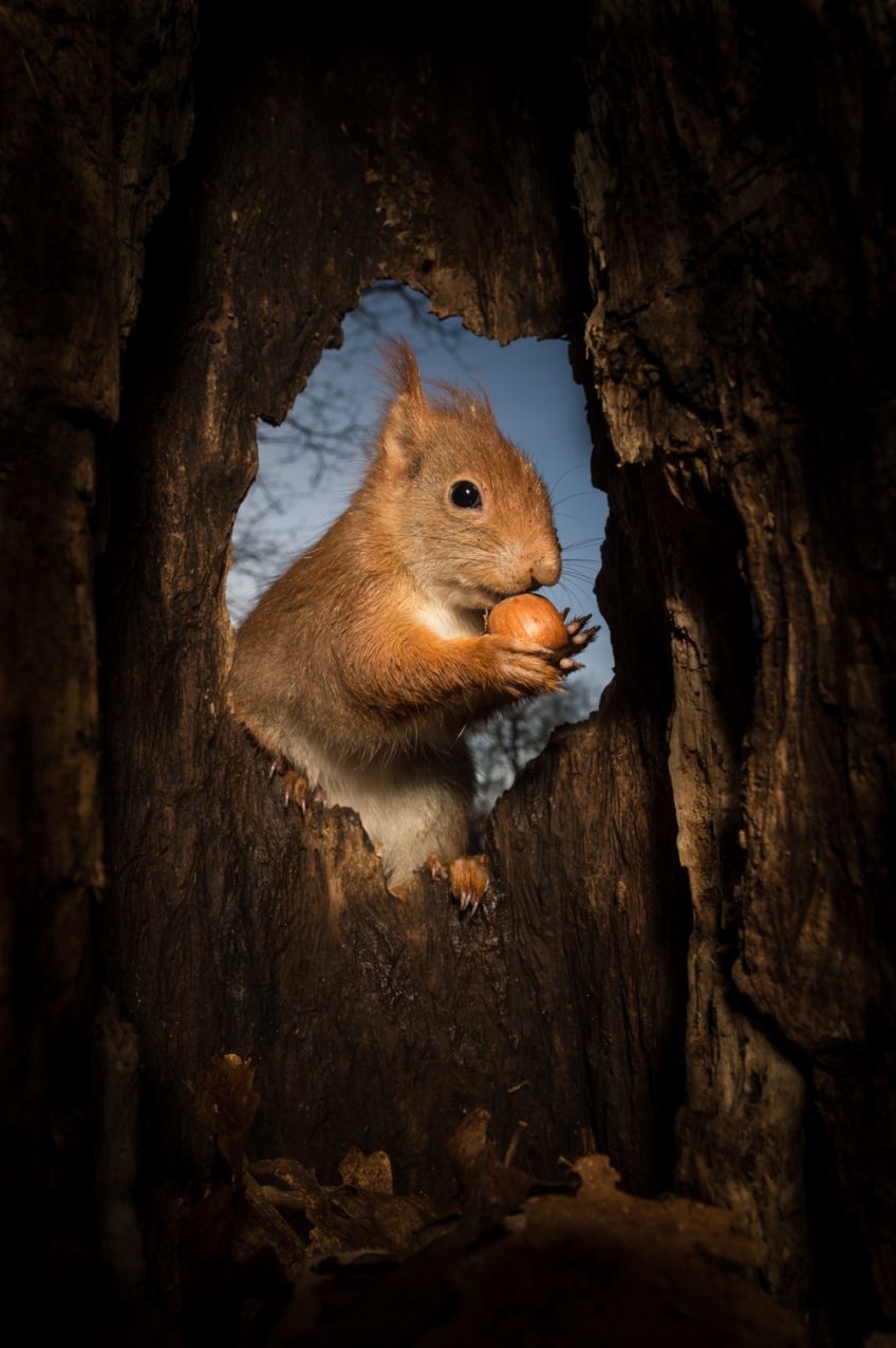 Cet hiver-là, je voulais photographier ce qui se passe de l'autre côté de l’écorce, quand l'écureuil disparaît dans un trou d'arbre. Au bout de nombreux repérages, j'ai trouvé un châtaignier avec une cavité utilisée par le rongeur et suffisamment large pour y cacher mon appareil photo. L’intérieur du tronc est esthétique, mais sombre et exigu. Il me faudra utiliser des flashs et un objectif court tel un grand-angle pour avoir un bel éclairage et un cadrage dynamique donnant la sensation de partager cet espace confiné avec l’animal.