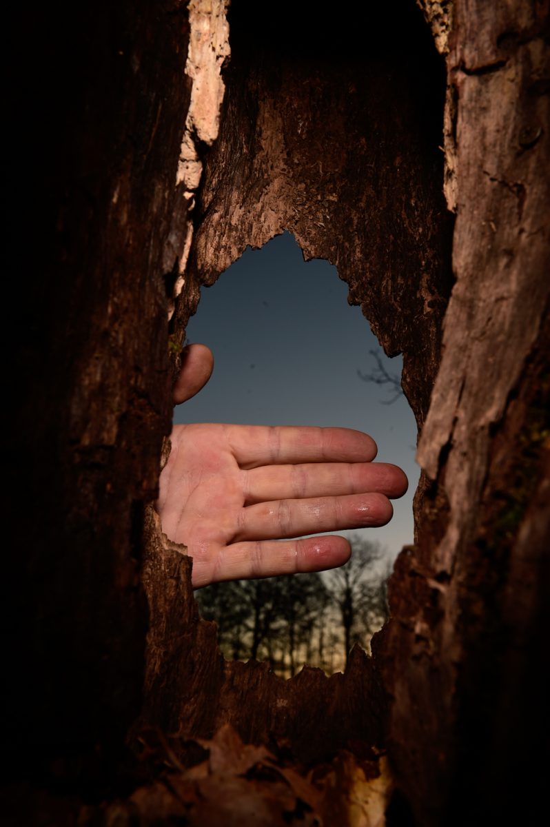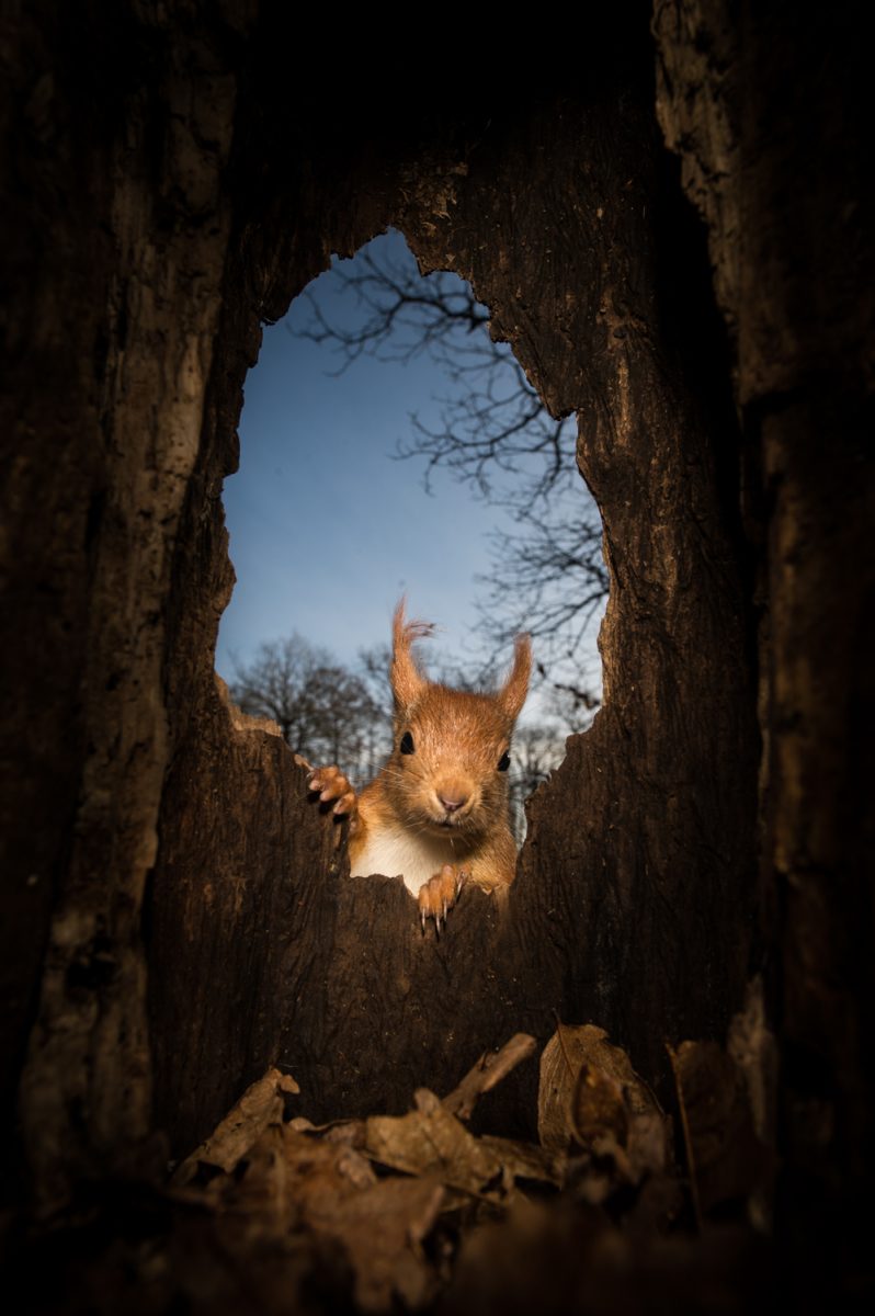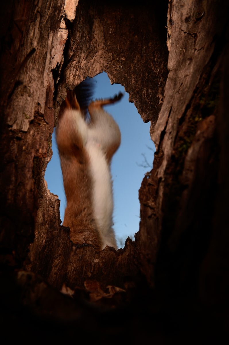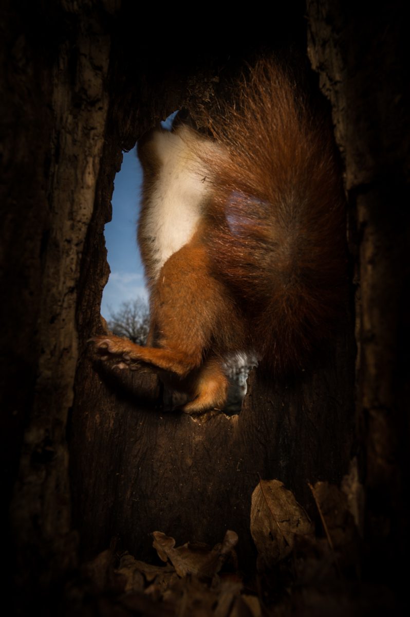Cet hiver-là, je voulais photographier ce qui se passe de l'autre côté de l’écorce, quand l'écureuil disparaît dans un trou d'arbre. Au bout de nombreux repérages, j'ai trouvé un châtaignier avec une cavité utilisée par le rongeur et suffisamment large pour y cacher mon appareil photo. L’intérieur du tronc est esthétique, mais sombre et exigu. Il me faudra utiliser des flashs et un objectif court tel un grand-angle pour avoir un bel éclairage et un cadrage dynamique donnant la sensation de partager cet espace confiné avec l’animal.