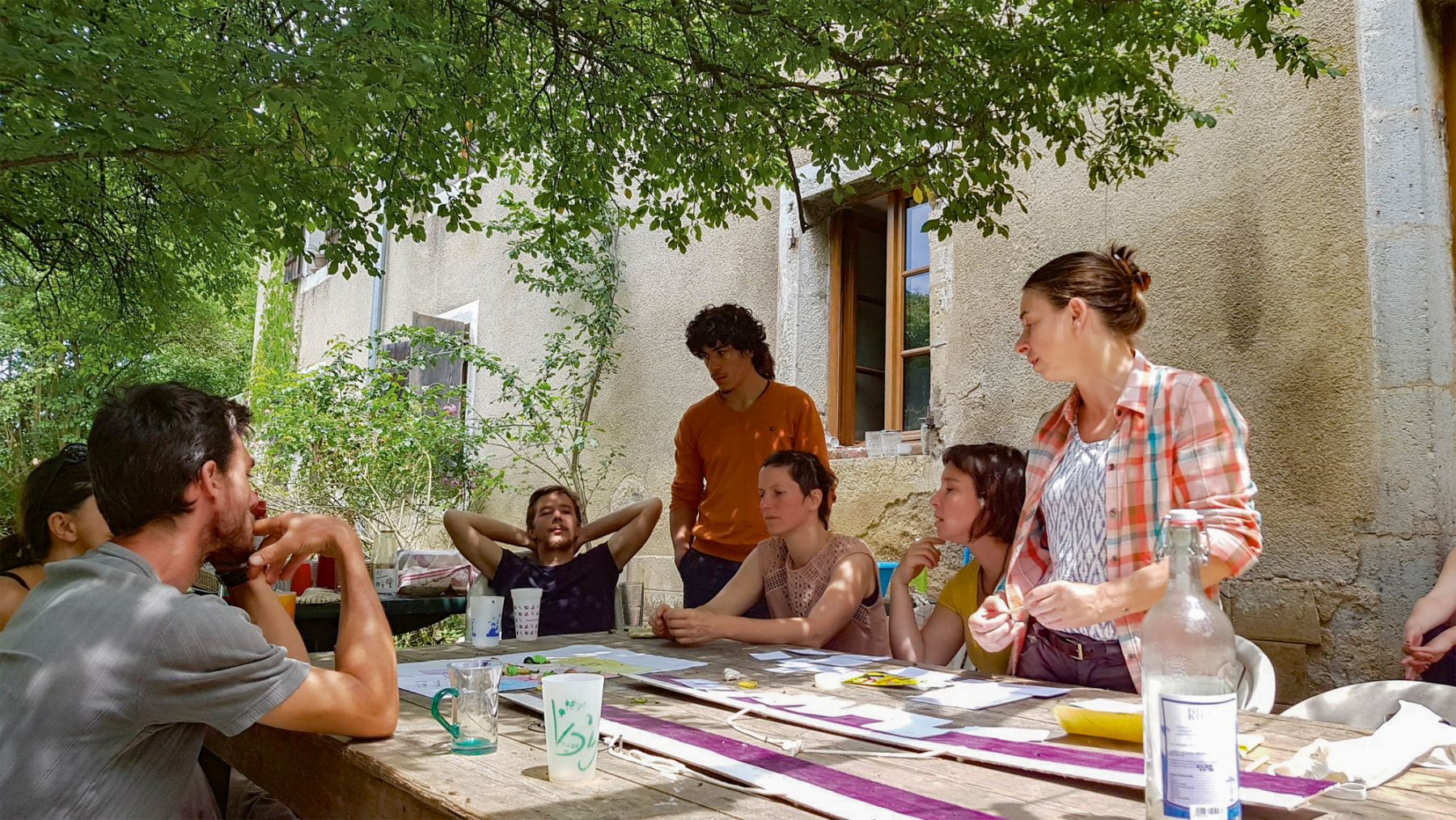 Tout a commencé en 2015 avec la mise en vente d’une vieille ferme en pierres entourée de 25 ha de terres près de la cité jurassienne de Salins-les-Bains. Le domaine composé de trois bâtiments dormait en bordure du village de La Chapelle-sur-Furieuse, depuis presque quarante ans. Quelques mois ont été nécessaires pour qu’une équipe de rêveurs conçoivent un projet commun. « Nous ne sommes pas une communauté, ce lieu n’est pas un refuge pour fuir un monde hostile, mais un terrain d’expérimentation », précise d’emblée Maryline Lethiec, cofondatrice du collectif. Inspirées par les concepts de l’Université du Nous et les oasis du Mouvement des Colibris, neuf personnes se sont lancées dans l’aventure de la gouvernance partagée, la vie sur place pour certains, le travail uniquement pour d’autres.