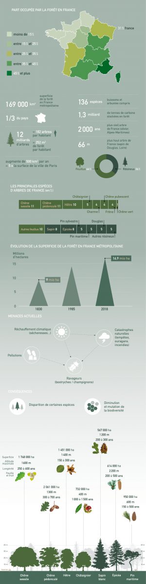 Elle occupe le tiers de l’espace autour de nous et gagne encore du terrain. Elle présente divers visages selon l’altitude et suivant qu’on l’exploite peu ou beaucoup. Voici la forêt française en chiffres.