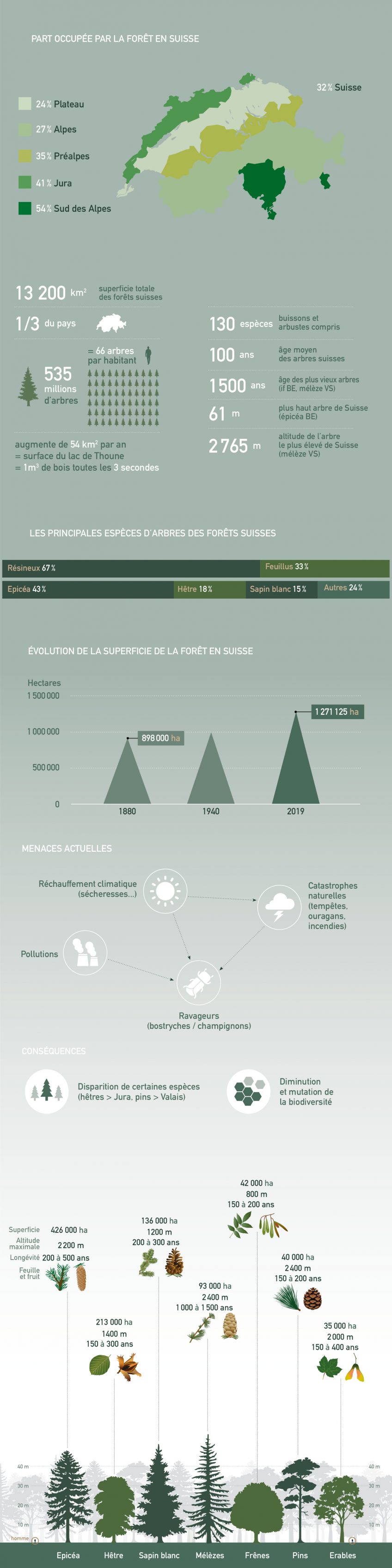 Elle occupe le tiers de l’espace autour de nous et gagne encore du terrain. Elle présente divers visages selon l’altitude et suivant qu’on l’exploite peu ou beaucoup. Voici la forêt suisse en chiffres.