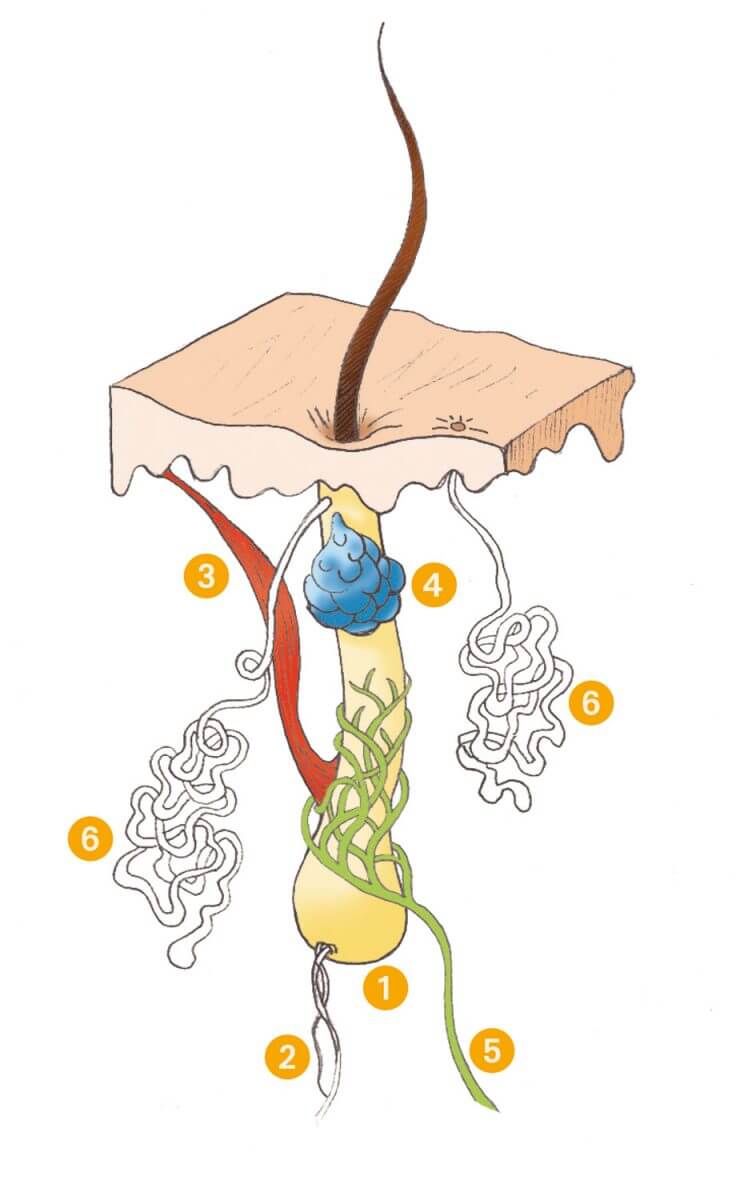 A la base du follicule pileux (1) des mammifères, des cellules spécialisées, les kératinocytes, produisent la matière du poil. La papille est alimentée en oxygène et nutriments par un fin vaisseau capillaire (2). Chaque poil est muni d'un muscle horripilateur (3) qui permet de le dresser et d'une glande sébacée (4) qui produit une sécrétion huileuse. Celle-ci s'étend sur la fibre, la protège et la fait briller. Des terminaisons nerveuses (5) permettent de percevoir les différentes pressions exercées sur le poil. Des glandes sudoripares (6) débouchent à la base des poils. Chez certaines espèces, un même follicule produit simultanément plusieurs poils.