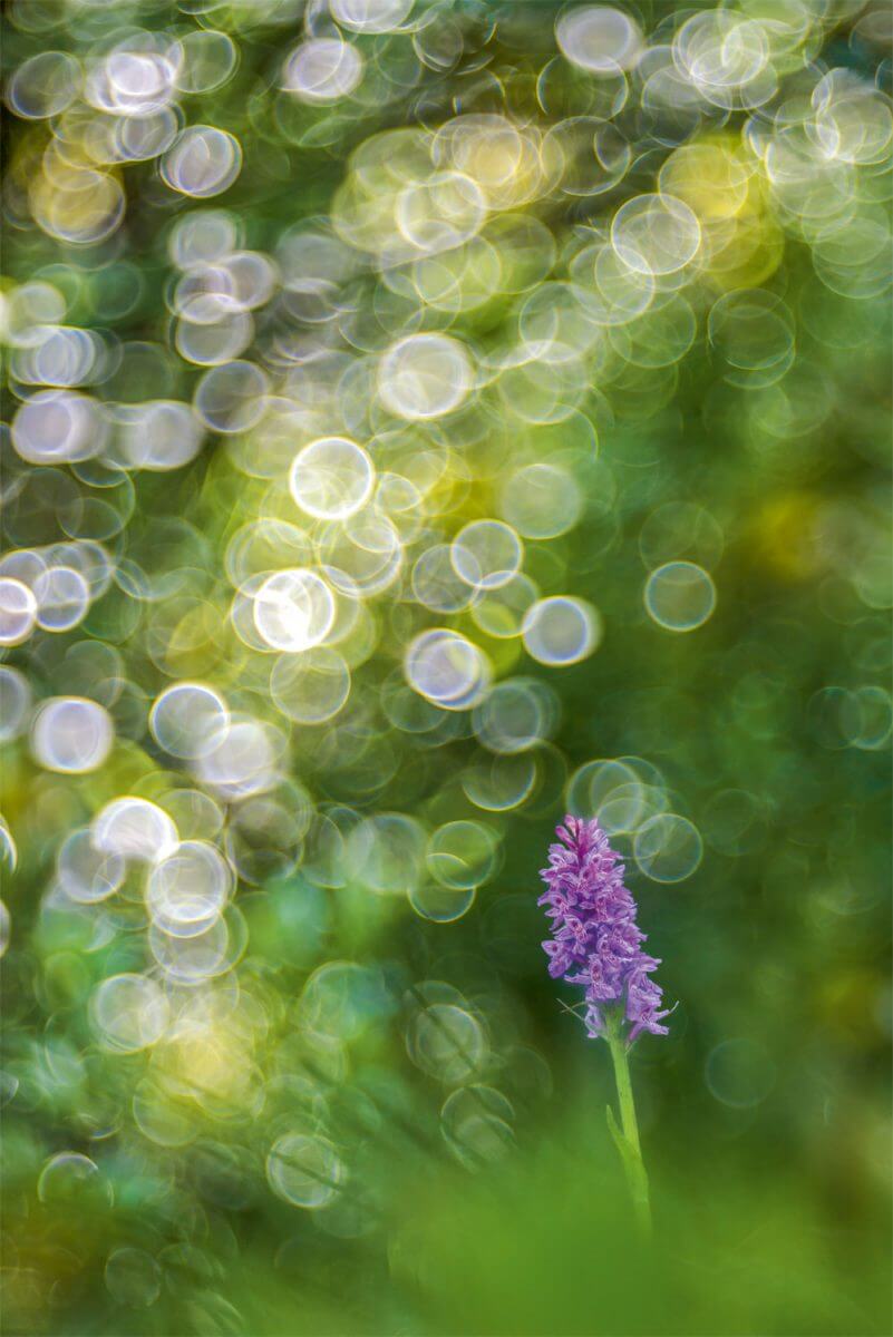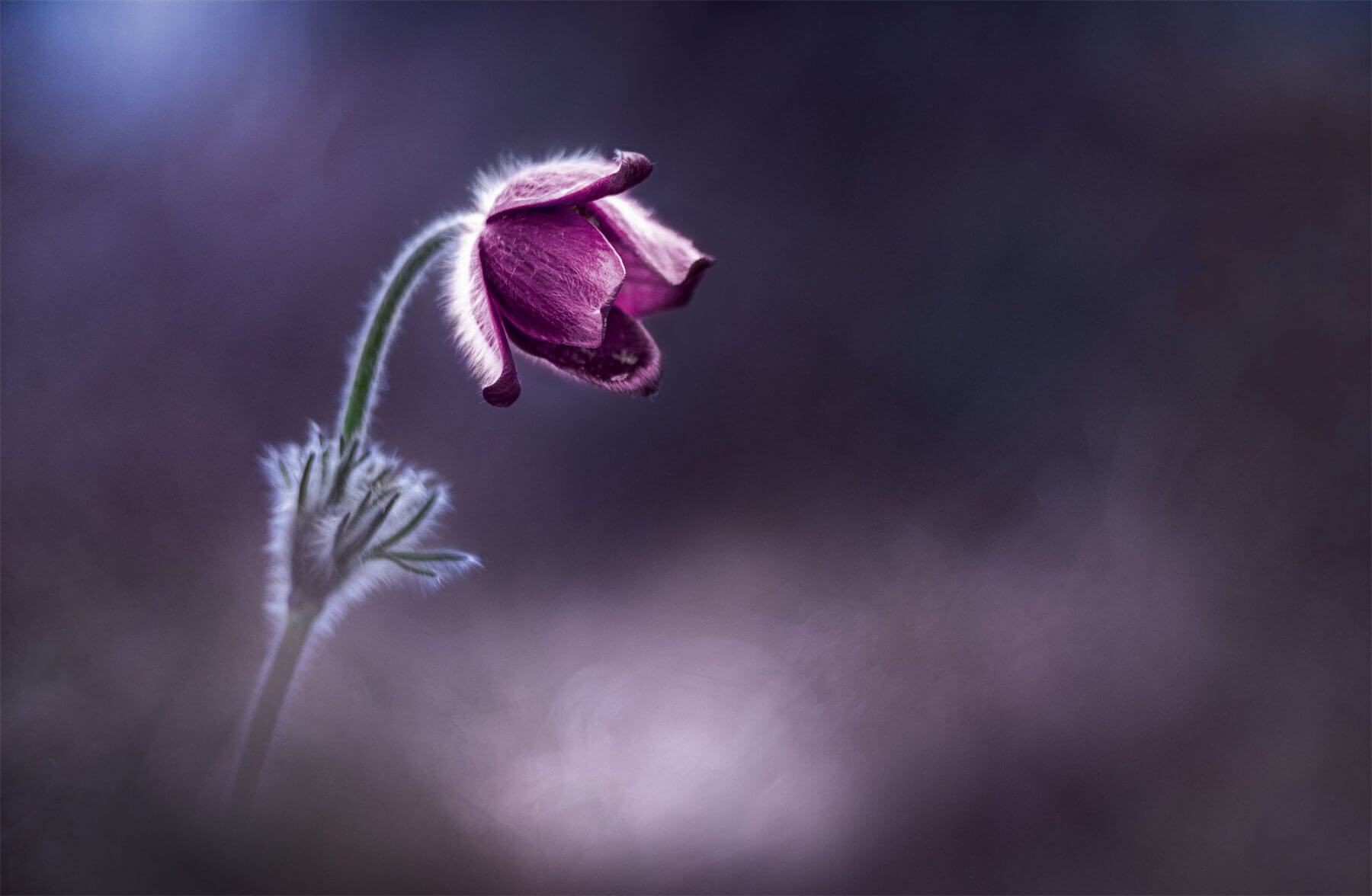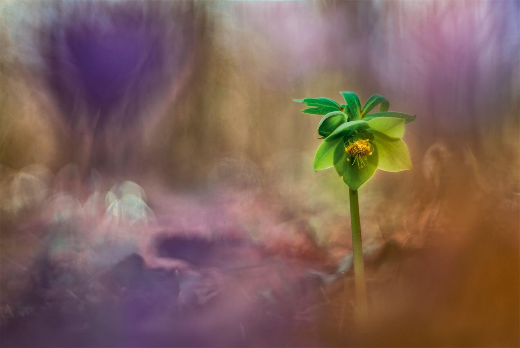 La plupart des photographes macro utilisent des objectifs modernes d’une qualité exceptionnelle et souvent munis d’un stabilisateur d’image. Un peu à contre-courant, Marco Zamò photographie les fleurs avec un objectif allemand des années 1950 à la mise au point manuelle. Employée avec un diaphragme ouvert au maximum, cette optique souffre beaucoup du flare. Dans certaines conditions, cette aberration due à la diffusion de la lumière entre les lentilles produit un effet bulle de savon ou un arrière-fond délavé et pictural. Défaut majeur pour certains, source d’inspiration pour d’autres..