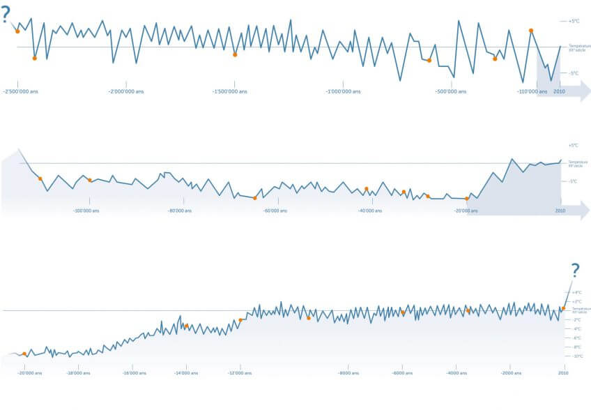-20'000 ans: Froid, froid, froid bis ! Deuxième maximum glaciaire encore plus intense que le premier. Le volume des glaces continentales représente 55 millions de km3. Un réchauffement suivra qui mettra en place le climat que nous connaissons.