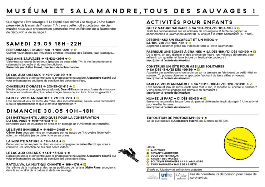 MUSÉUM ET SALAMANDRE, TOUS DES SAUVAGES ! A l’occasion de la nuit et journée internationale des musées 2021, la Salamandre s’invite au Muséum d’Histoire Naturelle de Neuchâtel du 29 au 30 mai pour vous faire découvrir la vie sauvage !