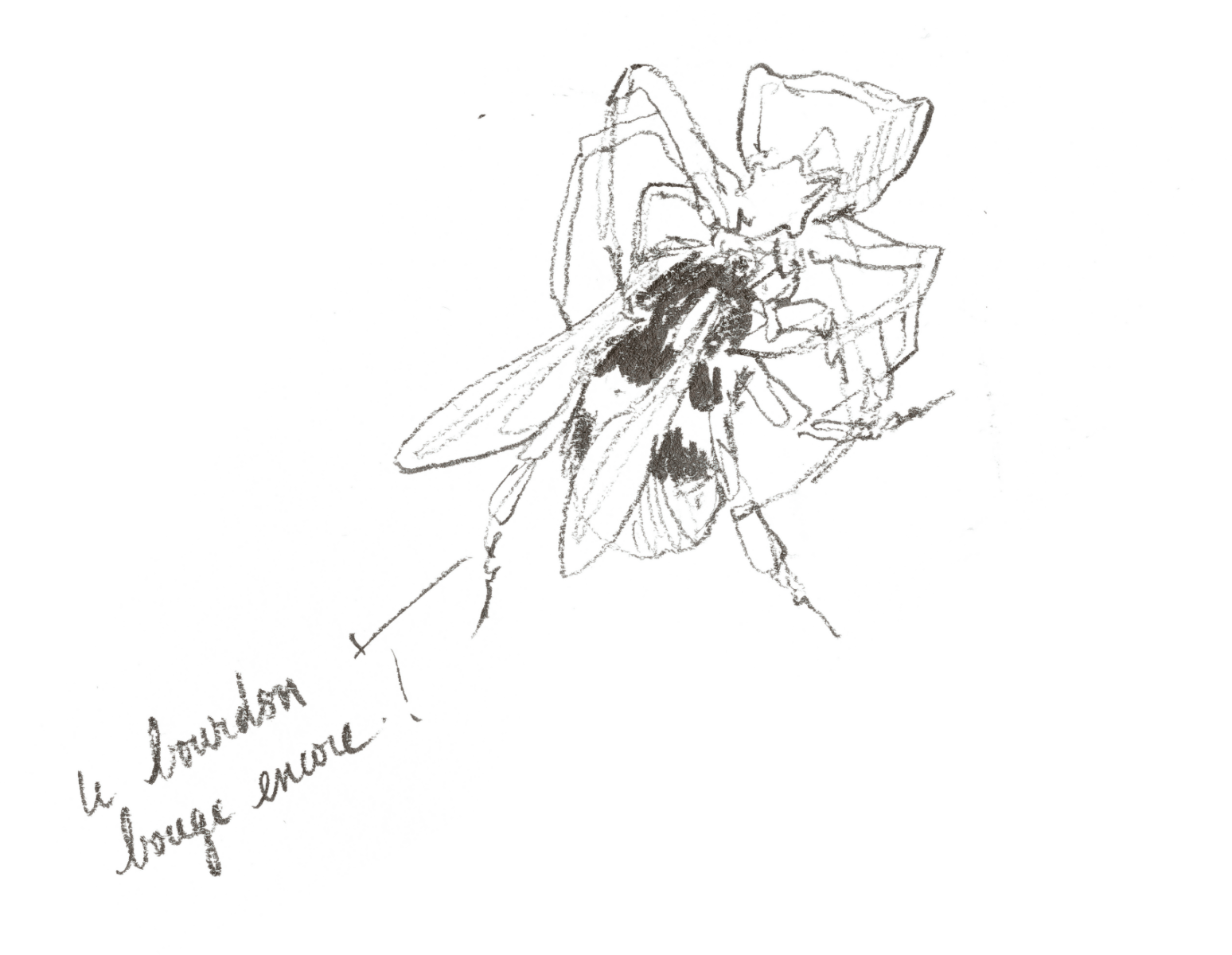 19 juillet Le soleil tape fort. Sans cesse des bourdons entrent et sortent du trou d’envol qui fait à peine un centimètre de diamètre. On imagine la reine qui participe aux travaux d’agrandissement du nid, les ouvrières qui ventilent l’air chaud en battant des ailes… La colonie prospère dans l’obscurité. Elle a heureusement échappé aux attaques des bourdons coucous.