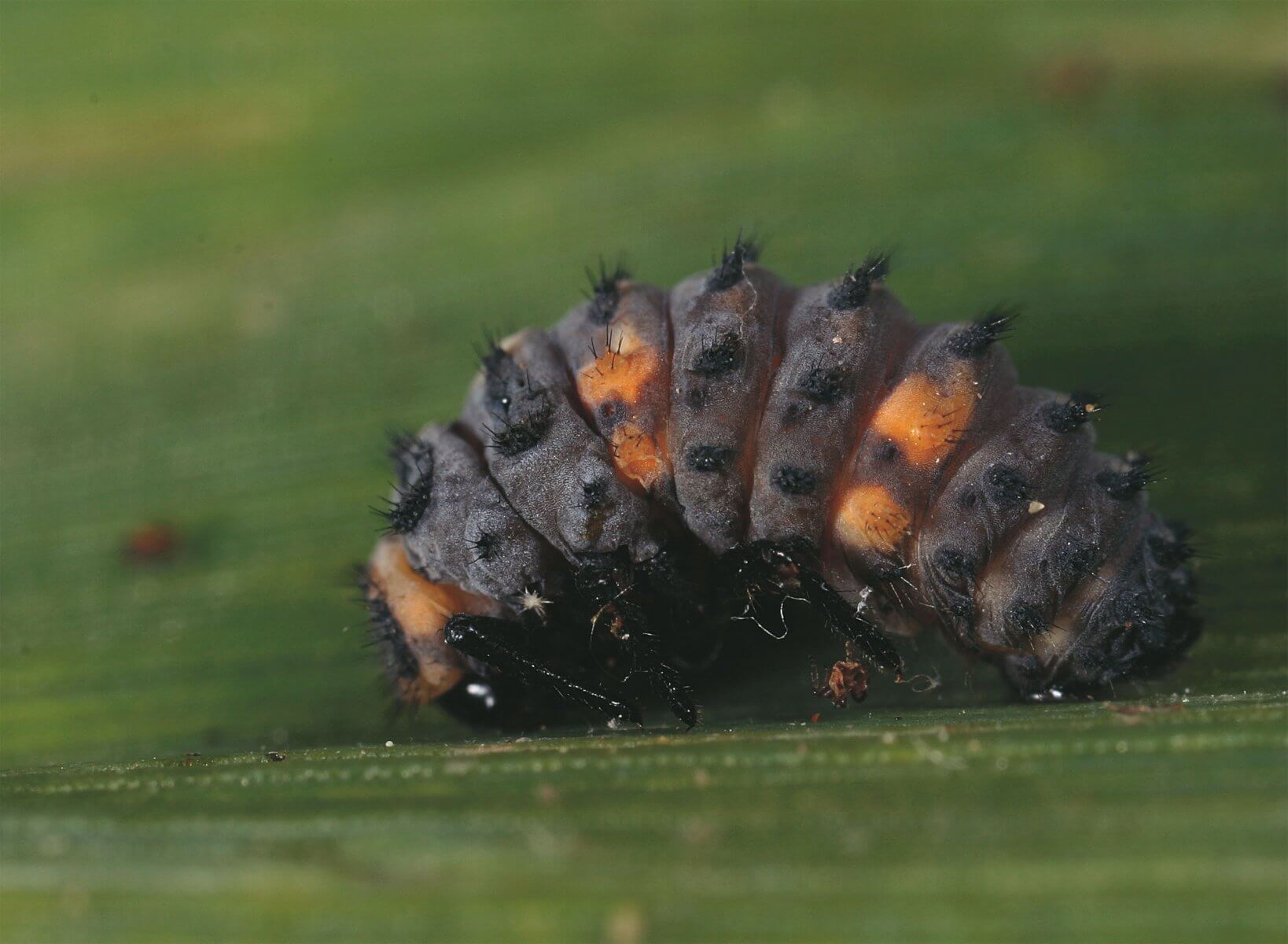Tiens, que se passe-t-il ? Une larve de coccinelle qui n’a pas faim ? Elle commence par se fixer à une tige avec sa ventouse abdominale. Puis la voici qui se fend d’avant en arrière, contracte son corps de manière rythmée et se dégage progressivement de son ancienne enveloppe. Toute claire comme au sortir de l’œuf, elle s’assombrit en peu de temps. Au bout d’une heure à peine, son festin peut reprendre.