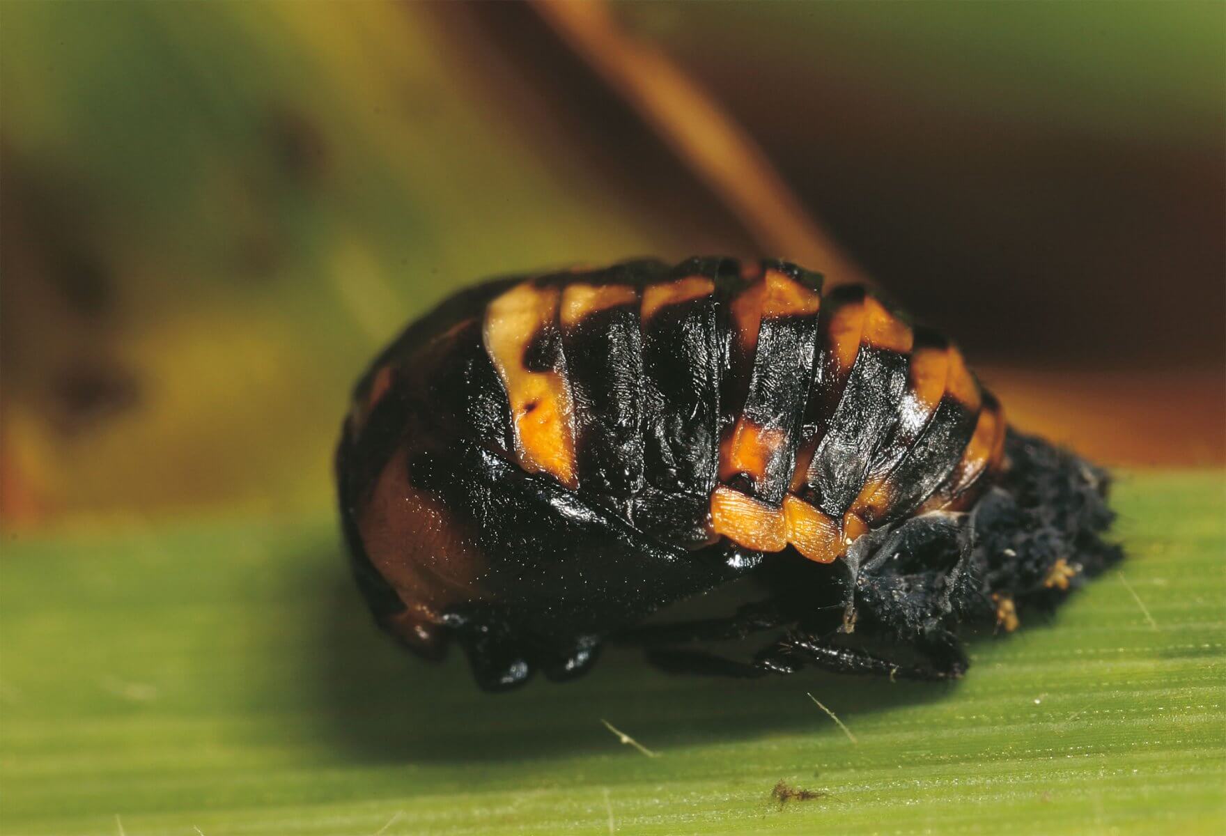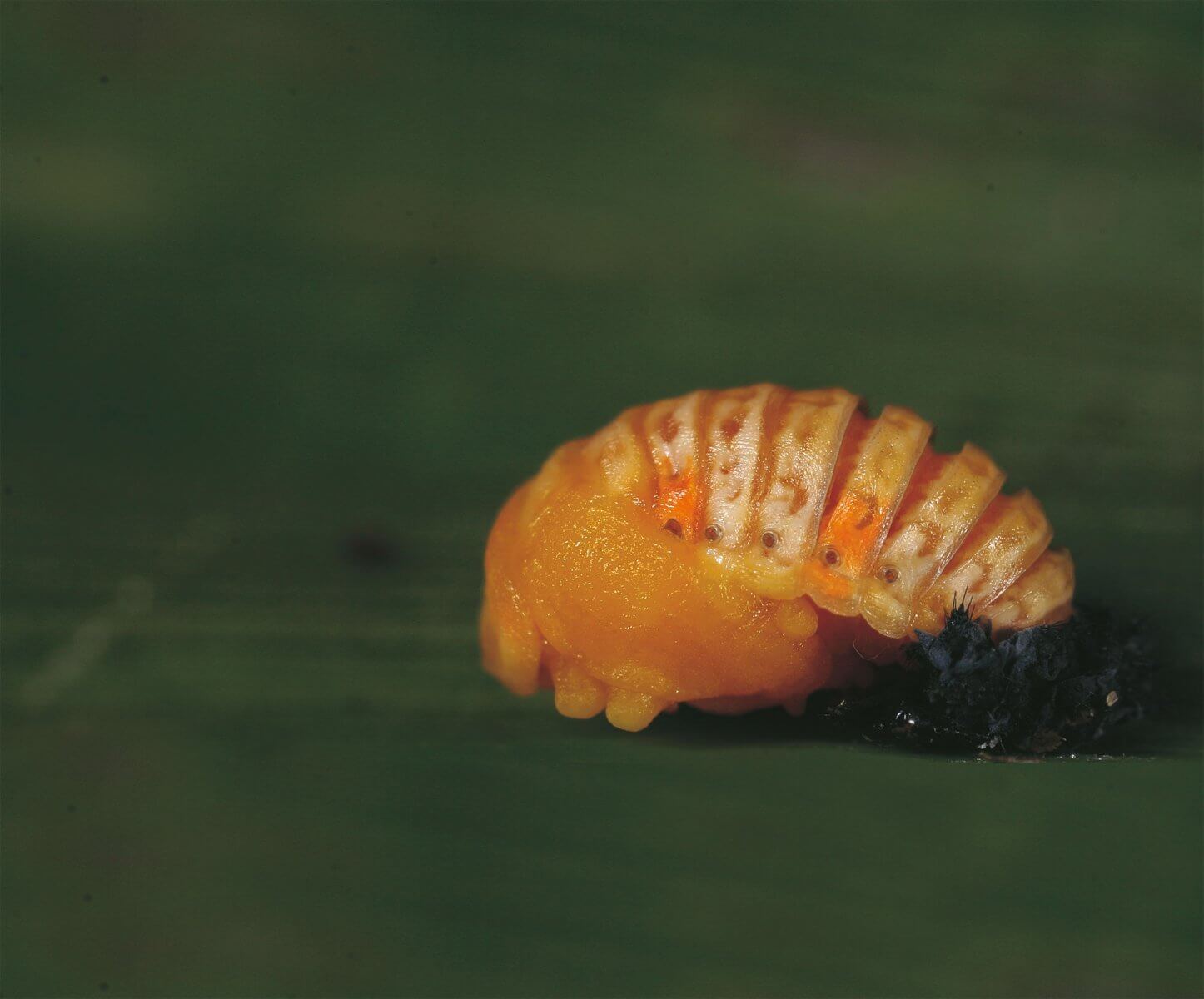 La dernière de ces opérations prend une tournure inattendue. Repue, la larve s’immobilise la tête en bas, puis s’arc-boute, pattes courbées en arrière. L’insecte entre en léthargie. Plus rien ne bouge pendant un jour. Quand la peau de son dos se déchire enfin, c’est pour libérer une créature orangée qui s’incline et se redresse à plusieurs reprises afin de se dégager de sa peau sombre. Après dix, vingt révérences, les mouvements convulsifs se calment. Il est temps d’observer en détail la nymphe, ce cocon hermétique dans lequel va naître une coccinelle adulte.