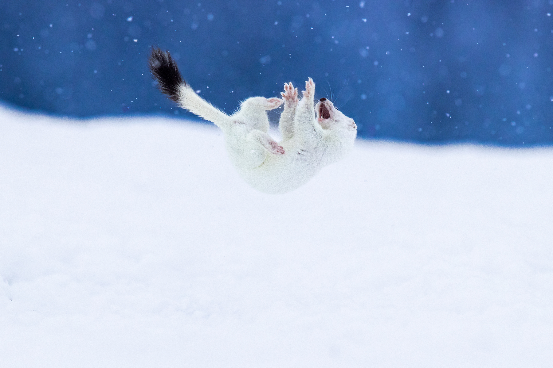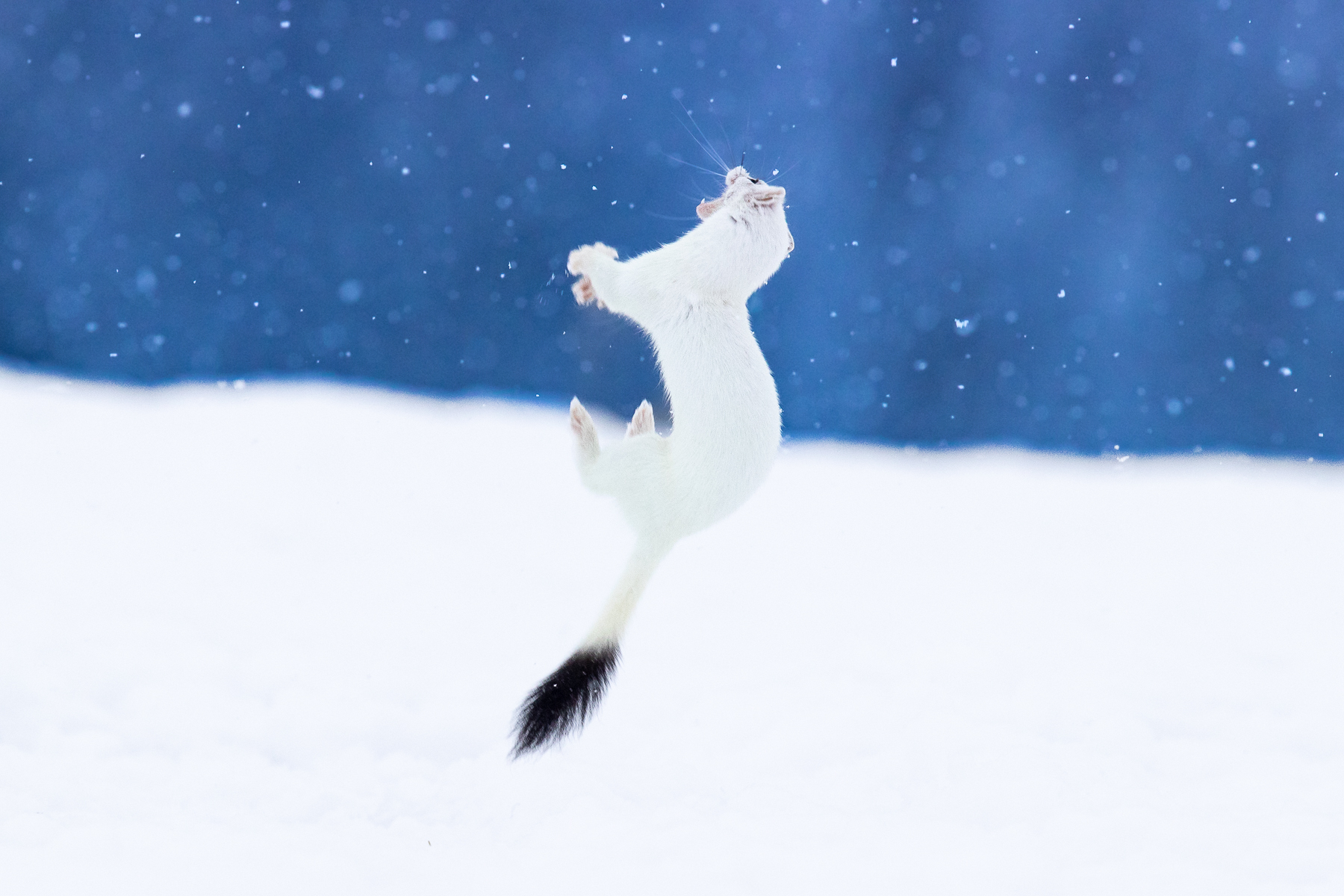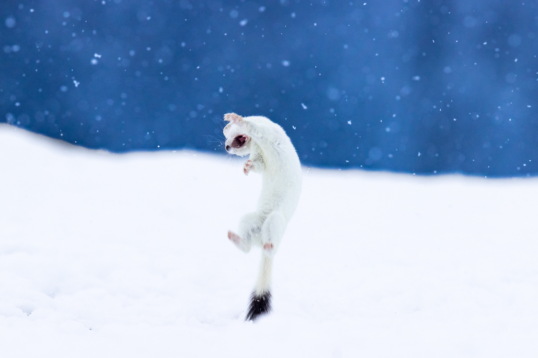 Au centre de ce théâtre improvisé, sur une surface d’environ 9 m2, elle enchaîne ensuite des allers-retours psychédéliques à une vitesse hallucinante, tout en mettant en scène des figures aériennes à faire trembler Maurice Béjart. Blanche comme neige sur la neige blanche, ballant comme un diable, l’hermine hypnotise aussi l’autofocus de mon appareil, qui essaie inutilement de faire la mise au point. Je passe en mode manuel pour saisir les sauts périlleux et les folles cabrioles qui composent cette chorégraphie mystérieuse : c’est « la danse de la guerre ». On dit qu’elle lui sert à magnétiser ses proies, mais certains scientifiques croient que ce comportement serait dû à une infection par un nématode. En tout cas, au vu de ce qu’elle dépense lors de son ballet sous les flocons, on comprend mieux pourquoi elle doit consommer chaque jour l’équivalent d’un tiers de son poids.