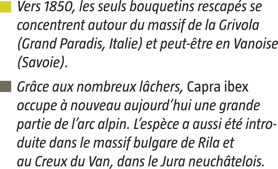 En France, les deux derniers bouquetins de la région du Mont-Blanc sont tirés. L’ongulé ne subsiste probablement plus qu’au Grand Paradis et peut-être en très petit nombre en Vanoise.