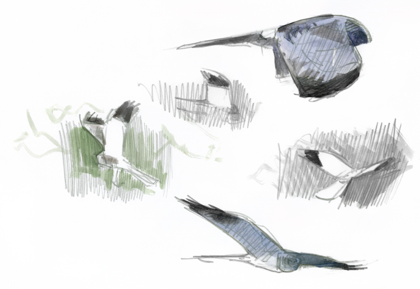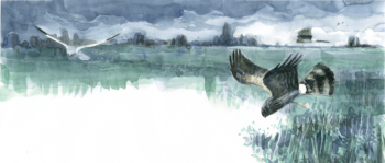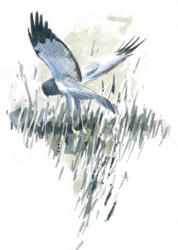 J’adore ces oiseaux élégants et opiniâtres qui survolent inlassablement le damier parcellaire monotone. Ils le font probablement avec méthode, mais en même temps avec un air nonchalant. Je remarque cet automne-là que les jeunes haies créées par Emmanuel ces dernières années – plusieurs kilomètres ! – sont prisées par ces drones à plumes. Il n’y a pas photo, dès qu’un peu de structure et d’irrégularité revient casser l’uniformité du paysage agricole intensif, la vie s’y accroche ou s’y faufile. Le busard prédateur a plus de chances de débusquer un bruant ou un campagnol dans les bandes fleuries ou au pied des buissons réimplantés que dans les déserts de terre labourée.