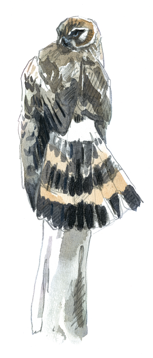 Le 7 novembre, je réussis à me poster assez tôt sur un point central de la plaine. La nuit tombe vite, il me faut être sur place avant 16 h. L’objectif est de suivre tout busard en maraude jusqu’au crépuscule, sans le lâcher des yeux, en espérant qu’il se pose dans le secteur pour y dormir. Dans ces conditions de faible lumière, les mâles essentiellement gris et blanc – avec la pointe des ailes noire – sont plus faciles à détecter. J’en repère un qui, par chance, va me mener presque directement au lieu de dortoir que je cherche. L’oiseau fantomatique fait plusieurs fois le tour du champ que j’ai progressivement approché. Toujours à très faible hauteur, entre 1 et 2 m, il feint quelques chutes puis remonte. Un second mâle est posé sur un chemin agricole, tandis qu’une femelle arrive en plein ciel à une vingtaine de mètres d’altitude.