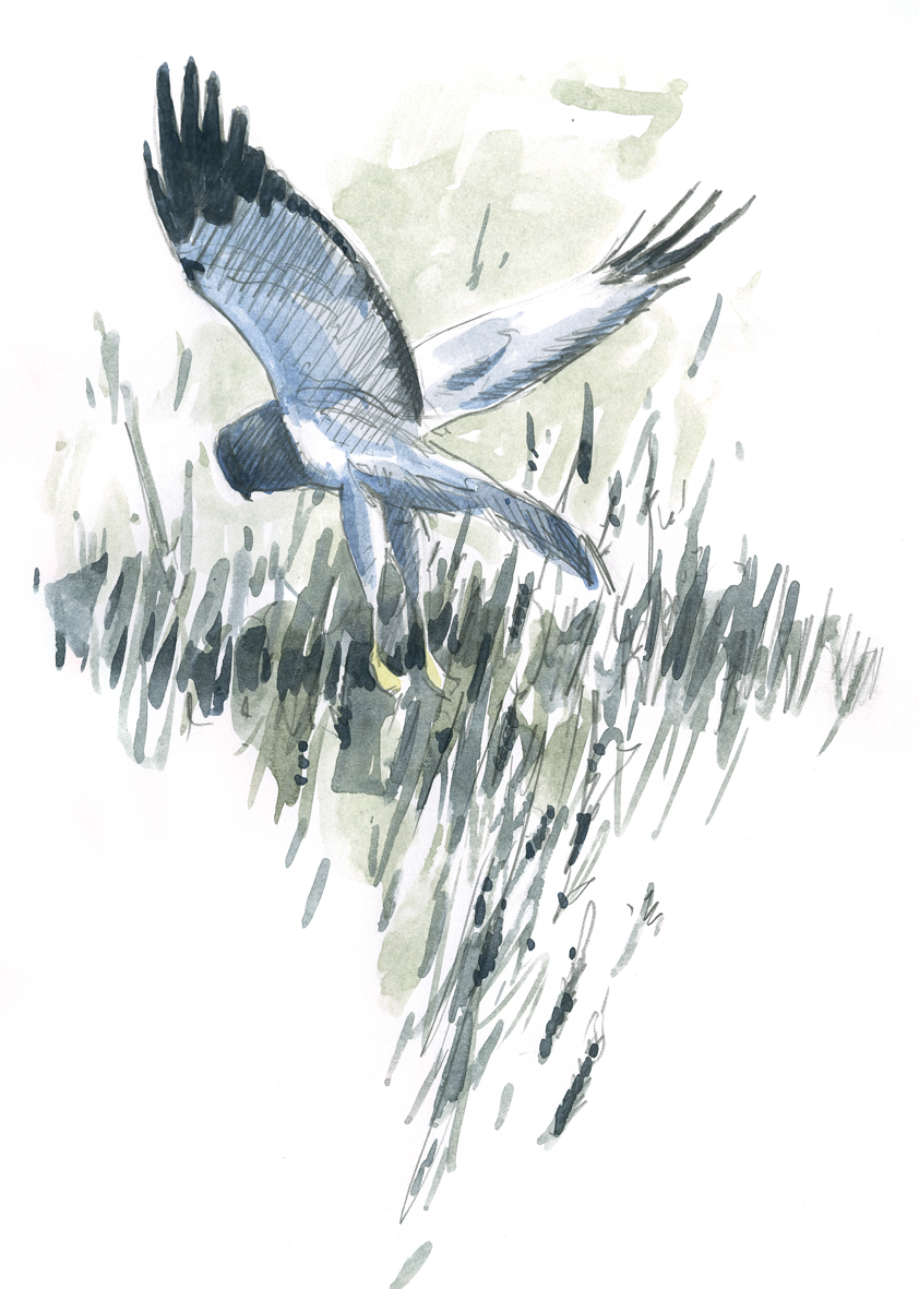 Connaissant la tendance grégaire de ces oiseaux la nuit à cette saison, je me convaincs de revenir un soir chercher un éventuel lieu de dortoir. À l’inverse des buses et autres faucons, les busards ne se posent généralement pas sur les arbres, les poteaux électriques ou les fils. Même leur nid est construit au sol. Entre octobre et mars, les individus hivernants, venus d’Europe du Nord, ont pour habitude de se réunir pour la nuit, à terre, dans une végétation herbacée de quelques dizaines de centimètres de haut. Suffisamment élevée pour les dissimuler et les abriter du vent, mais suffisamment basse pour leur permettre de s’y poser et d’en décoller aisément. Ces refuges nocturnes peuvent être très divers : landes, coupes à blanc en forêt, marais, jachères ou cultures.