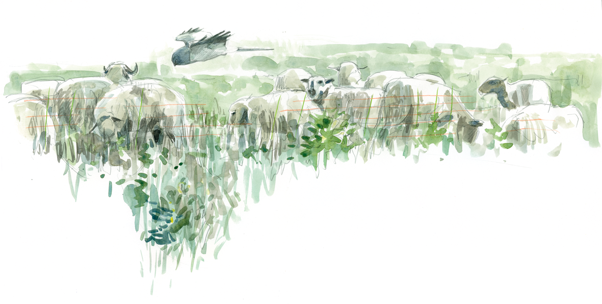 Je ne tarde pas à prévenir l’agriculteur dont je sais qu’il apprécie les anecdotes ornithologiques qui concernent ses terres. « C’est un mélange de seigle et de vesces, un couvert végétal pour l’hiver », me renseigne-t-il, tout en me demandant des précisions sur ces oiseaux qu’il ne connaît pas. Dans l’échange, je lui demande s’il a noté davantage de campagnols cet automne dans le secteur. « Je sais que le chien d’Eugénie, la bergère, en croque quelques-uns dans mes parcelles. » Bien sûr, mon principal souci est de savoir si le faciès de ce pré va perdurer plusieurs semaines. La réponse me parvient par SMS le soir même : « Eugénie sera dans ce champ dans huit à dix jours avec ses moutons. » La nouvelle me déçoit momentanément, mais il faut bien que ces réalités pragmatiques d’éleveuse ovine et d’exploitant agricole se déroulent. C’est le jeu, les busards trouveront un autre hôtel pour la suite de la saison froide.