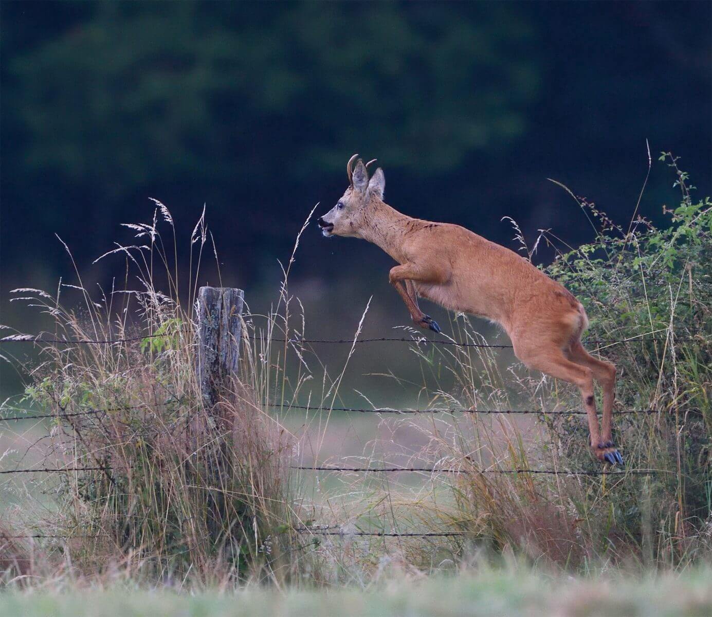 Train postérieur plus haut que l’antérieur, cuisses arrière musclées et cou élancé : le chevreuil est parfaitement taillé pour bondir. Lancé en pleine course, il est capable d’effectuer des sauts jusqu’à 6 m de long. A l’arrêt, il peut franchir des obstacles de 1,8 m de haut.