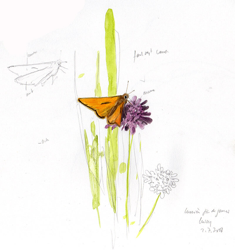Je m’arrête pour dessiner et peindre cette hespérie du dactyle ; tons orange sur tons mauves, c’est parfait ! »