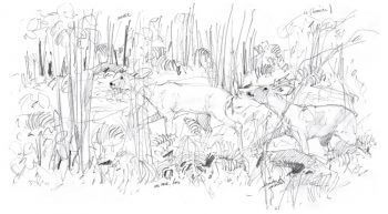« 10h30, belle journée ! Accompagné de Basile, mon aîné, je me dirige vers le bord d’un ruisseau situé en lisière d’un bois. Notre espoir est de relever quelques empreintes de cerf. Soudain, des fougères bougent en contrebas du chemin. Deux chevreuils apparaîssent : un mâle qui suit inlassablement une femelle, cou tendu, nez au vent. Le couple effectue des allers-retours sinueux en sous-bois, indifférents à notre présence. A quelques mètres d’eux, je réalise un crayonné partiel que je finaliserai de mémoire à la maison. »