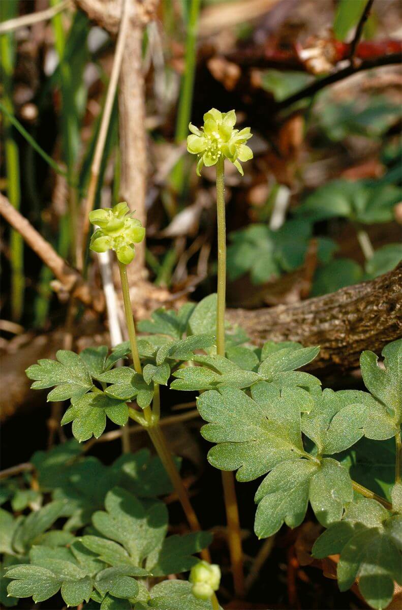 Un peu plus tardive que l’anémone sylvie aux pétales blancs, l’anémone fausse renoncule fréquente les bois humides. Cette plante toxique avance chaque printemps de deux ou trois centimètres, selon la pousse de sa tige souterraine. Ses éclatantes fleurs jaunes, souvent deux par pied, tournent en suivant le soleil. De nuit ou par temps pluvieux, elles s’économisent en refermant leurs pétales. Parfois, l’anémone monte en tige pour produire, après quelques feuilles déformées, non pas une fleur classique mais la fructification également jaune d’un champignon parasite. Celui-ci inhibe la floraison de son hôte et stimule sa pousse pour que ses spores s’envolent de plus haut.