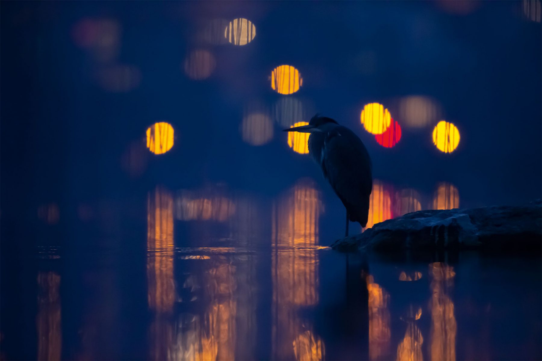 Il fait déjà très sombre au cœur de la végétation. Je me perds à deux reprises avant de rejoindre l’endroit souhaité. Je devine enfin la silhouette de l’oiseau à une cinquantaine de mètres… Touc ! Mon radeau tape contre la mini-banquise qui fige les roseaux. Tel un brise-glace dans la nuit boréale, avec le reflet des lampadaires au lieu des aurores, je pousse mon affût en faisant craquer la fine couche de glace pour me frayer un passage vers le héron. Je m’arrête avant de l’apeurer, puis, ensemble, nous assistons au réveil des lueurs multicolores du littoral.