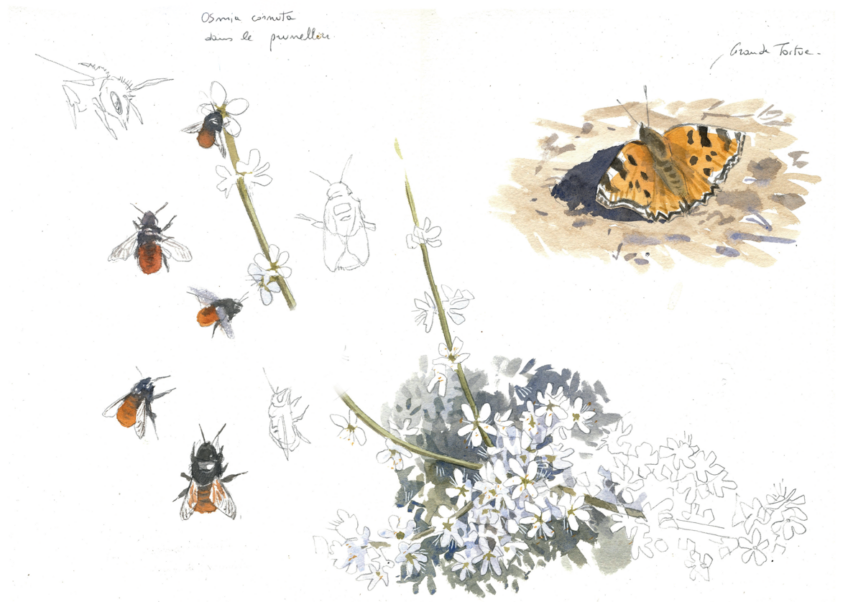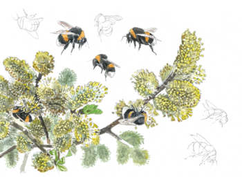 Peu intéressée, la reine de bourdon s’est déjà envolée vers la lisière du bois et tourne autour d’un prunellier. L’odeur des fleurs est enivrante. Elle tente de se poser sur un rameau, mais les petites fleurs blanches s’effritent et tombent comme des flocons de neige. Malheur… sa corpulence n’est pas des plus pratiques ! À sa gauche, une osmie cornue virevolte avec aisance et s’attribue tout le nectar. Quelle ingrate ! Notre reine détecte alors un autre parfum végétal dans le voisinage, encore plus attirant. C’est celui d’un saule marsault mâle, qui étale toute la splendeur de ses nombreux chatons dorés.