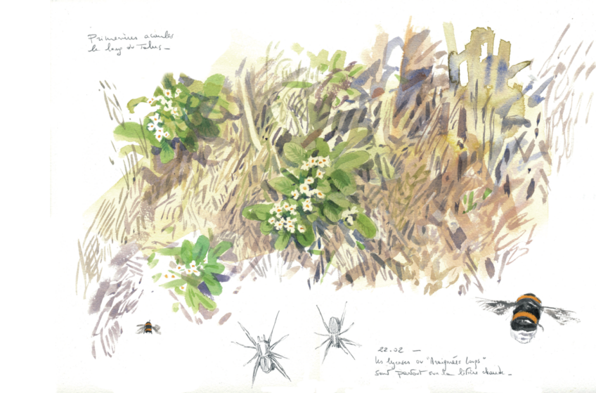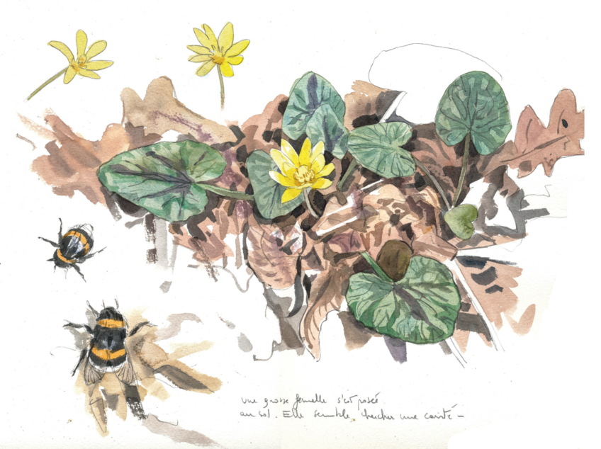 En faisant l’état des lieux, elle constate le travail qu’il lui reste à accomplir. Construire les premiers pots en cire pour stocker le nectar, élaborer les cellules du couvain et les approvisionner en pollen. Les œufs qu’elle y pondra deviendront la première génération d’ouvrières qui la secondera dans l’entretien de la colonie. Avec un peu de chance, le talus verra voler au moins une centaine d’entre elles cet été, ainsi que des mâles et de jeunes reines vers la fin de la saison. Ces dernières, une fois fécondées, passeront également l’hiver dans le sous-bois en portant en elles la promesse d’un nouveau printemps riche en bourdonnements royaux.