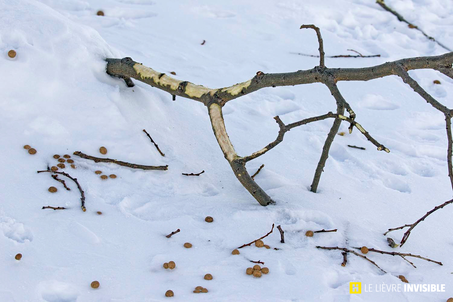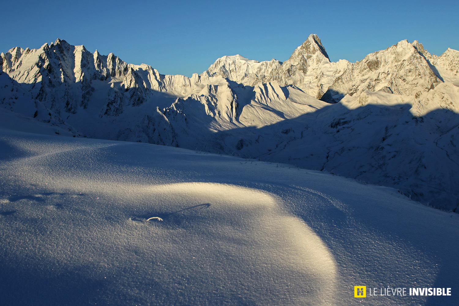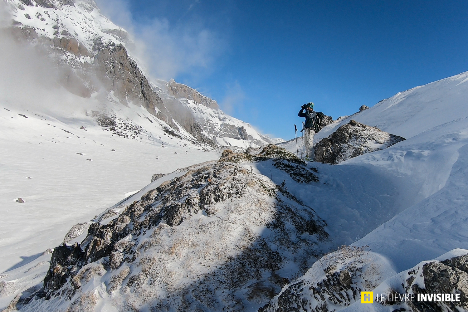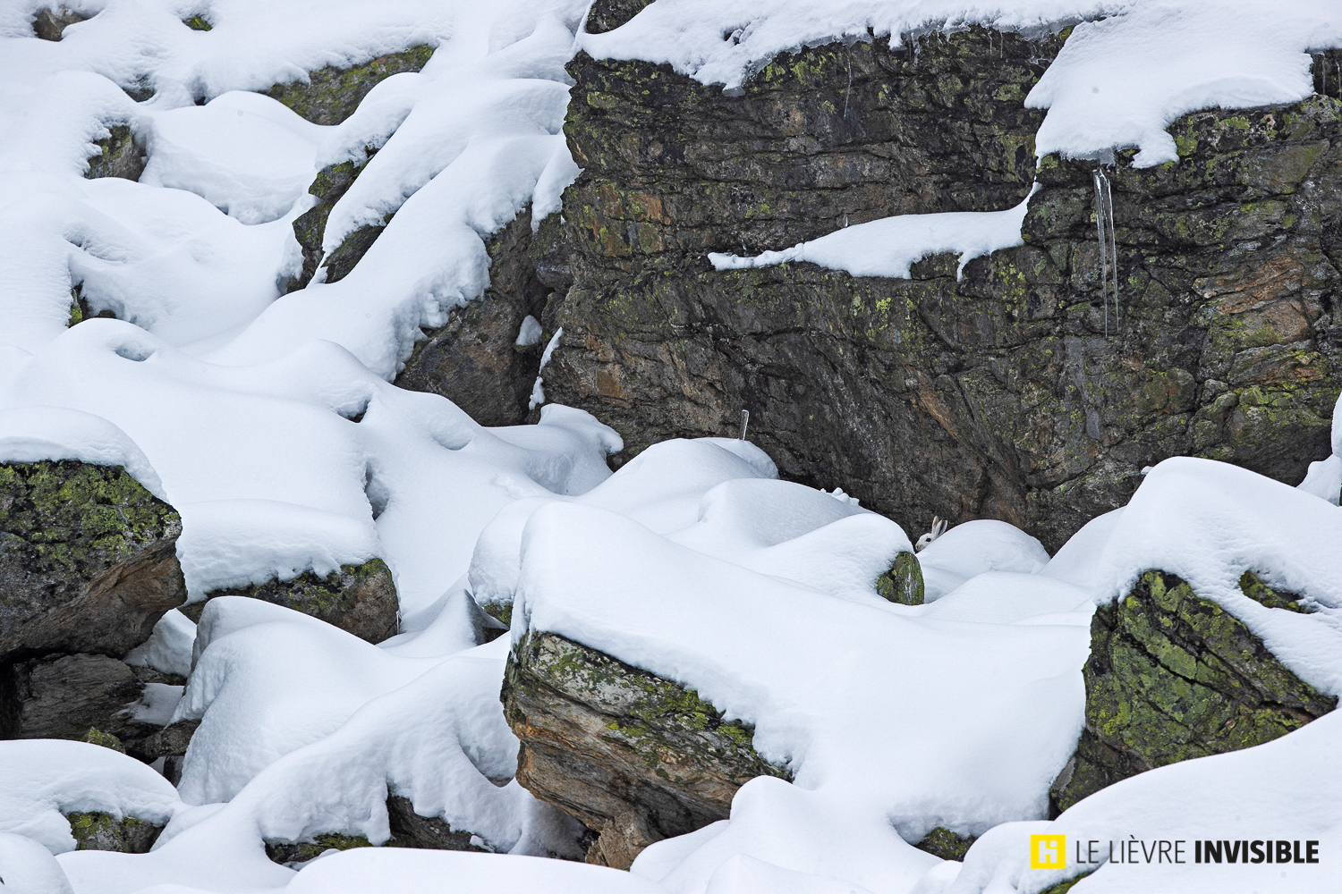 Nous scrutons le pied des rochers aux jumelles, la base des quelques mélèzes encore présents à cette altitude. Mais rien, absolument rien. Blanc sur blanc, le lièvre variable sait toujours comment passer inaperçu. Et les heures filent. Rien ne sert de suivre les traces observées pendant la recherche. Elles montent, descendent, tournent en rond, puis reviennent au point de départ. Comme à son habitude, le blanchon nous promène. La fatigue se fait sentir, le poids du sac à dos presse sur les épaules. Il est là pourtant, quelque part. Mais où ? Notre enthousiasme s’effrite, nos certitudes disparaissent avec le soleil qui repart derrière la montagne. C’est l’heure de rentrer, avec l’impression d’être des piètres pisteurs, mais aussi avec l’envie de revenir au plus vite. Pour sûr, il nous a repéré, lui. Et vous, l’avez-vous vu ?