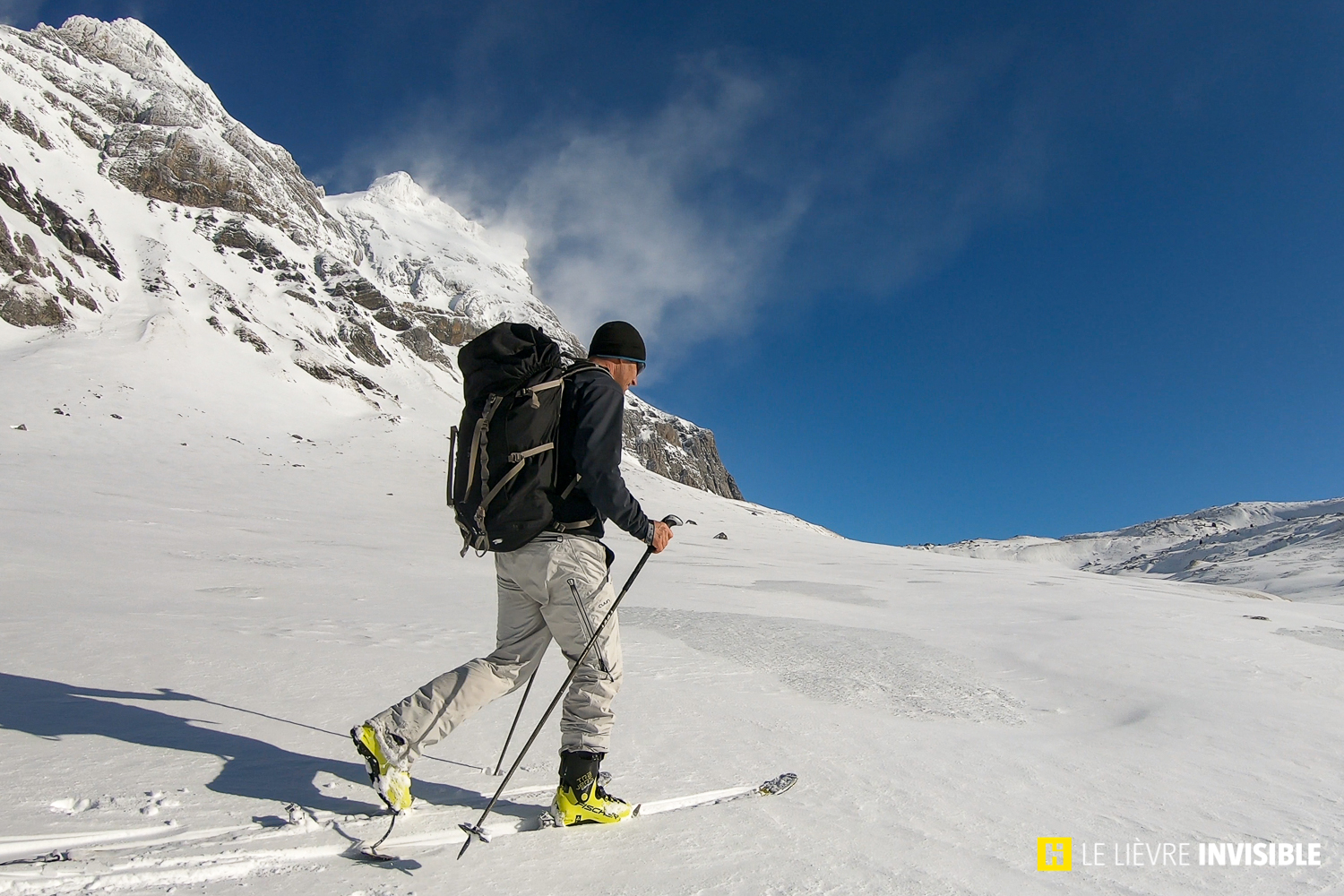 Altitude 1965 m, déjà deux heures de montée. Le soleil vient de passer la crête. Enfin. Il fait tout de suite meilleur malgré le petit vent qui descend du glacier. Un vol de chocards à bec jaune s’amuse en criant dans les ascendances thermiques le long d’une grande paroi gris-ocre. A plusieurs reprises, notre trace croise la piste d’un lièvre… variable ou d’Europe ? Pas toujours facile à dire. Nous avons également noté la présence de crottes au pied des rosiers et des vernes. Des taches d’urine aussi, d’un rose orangé caractéristique. C'est prometteur.