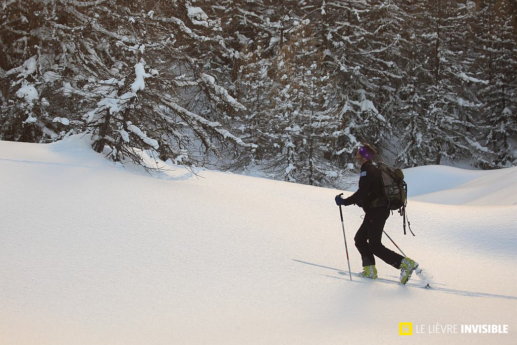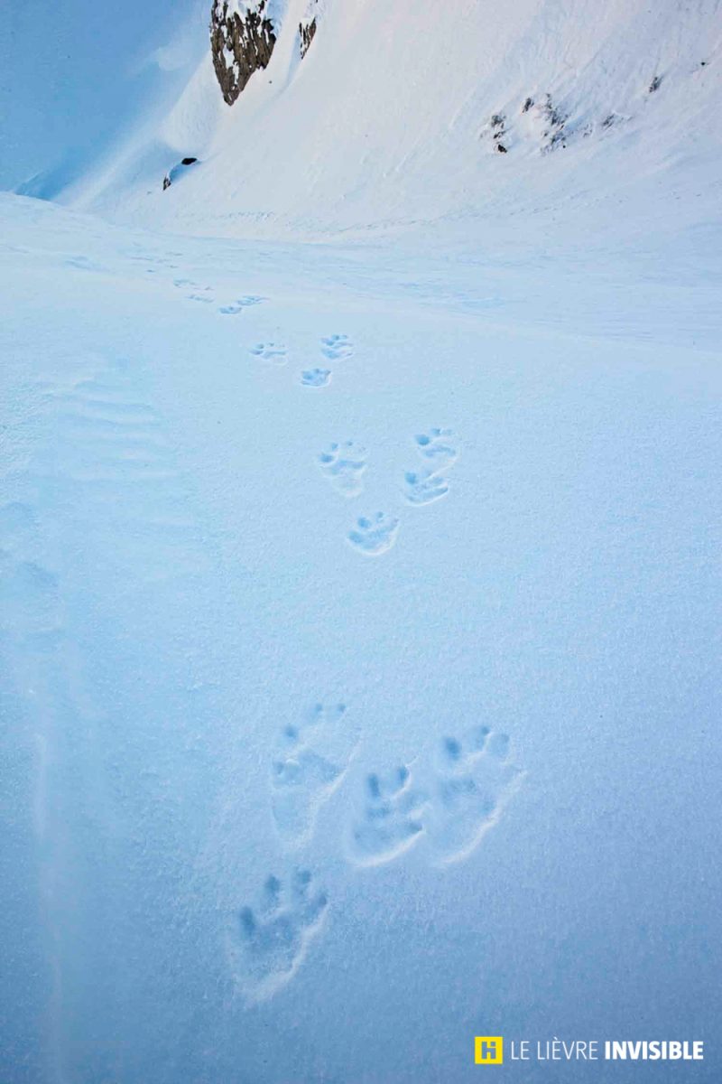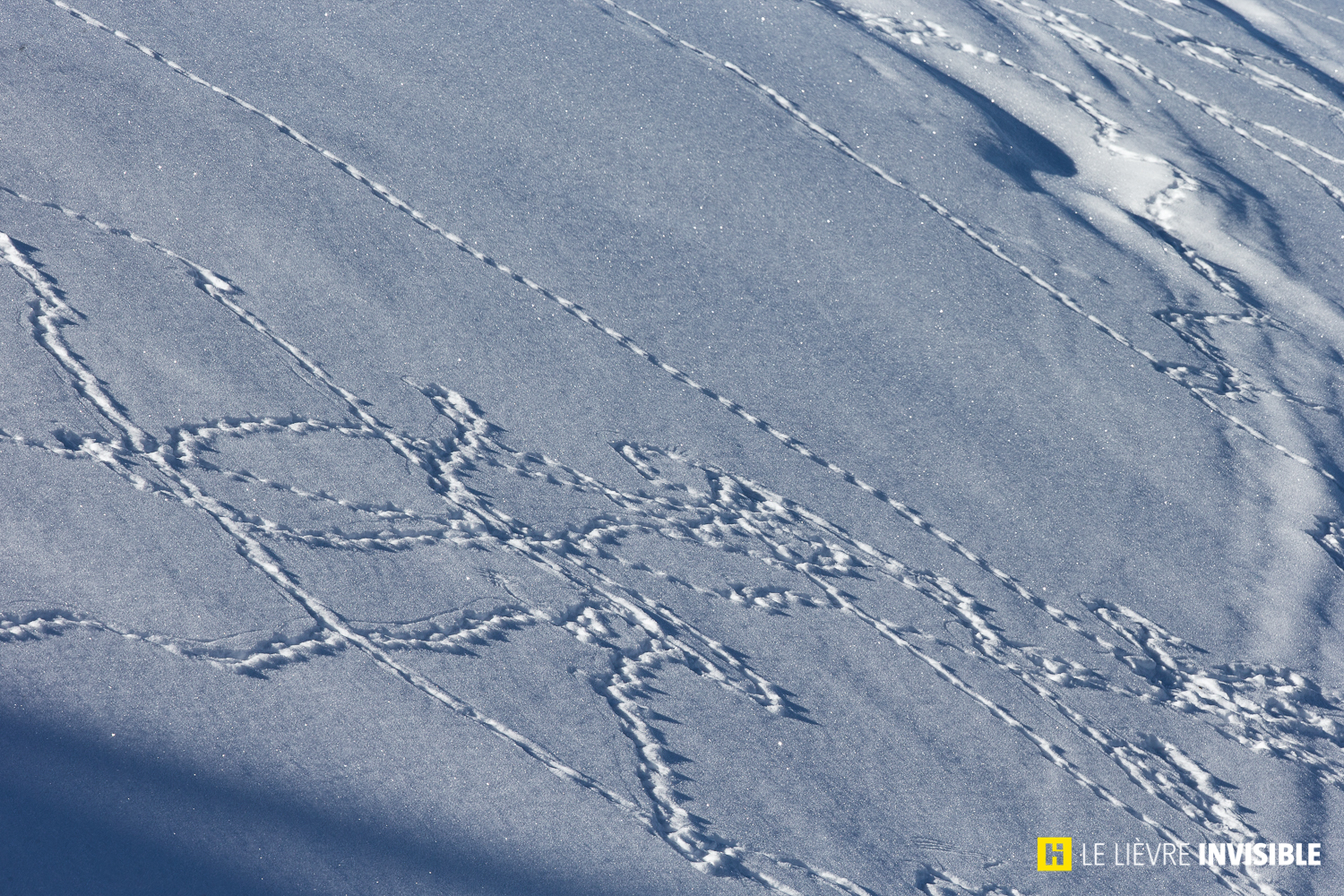 La neige dure crisse sous les skis. Depuis notre dernière expérience à la recherche du lièvre variable, la lecture de la neige nous a beaucoup appris. Ce n’est donc pas tout à fait par hasard que nous nous dirigeons vers un haut plateau situé à 2300 m d’altitude. Le chant des grives draines et des petits coqs dans les épicéas nous rappelle que bientôt la neige aura disparu, et avec elle beaucoup des indices qui nous permettent encore de repérer les animaux. Profitons-en. Dans les combes, le vent a accumulé un peu de neige et de givre, trahissant le passage d’un renard, d’une hermine, d’un tétras lyre qui a traîné ses ailes au sol en paradant… et d’un lièvre. A la taille de ses pieds, nous pensons qu'il s'agit d’un blanchon. Demeurera-t-il invisible cette fois aussi?