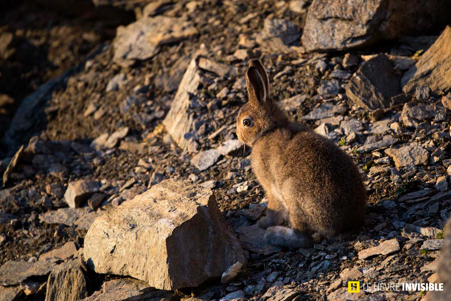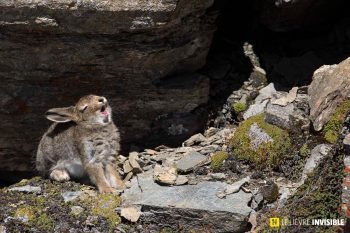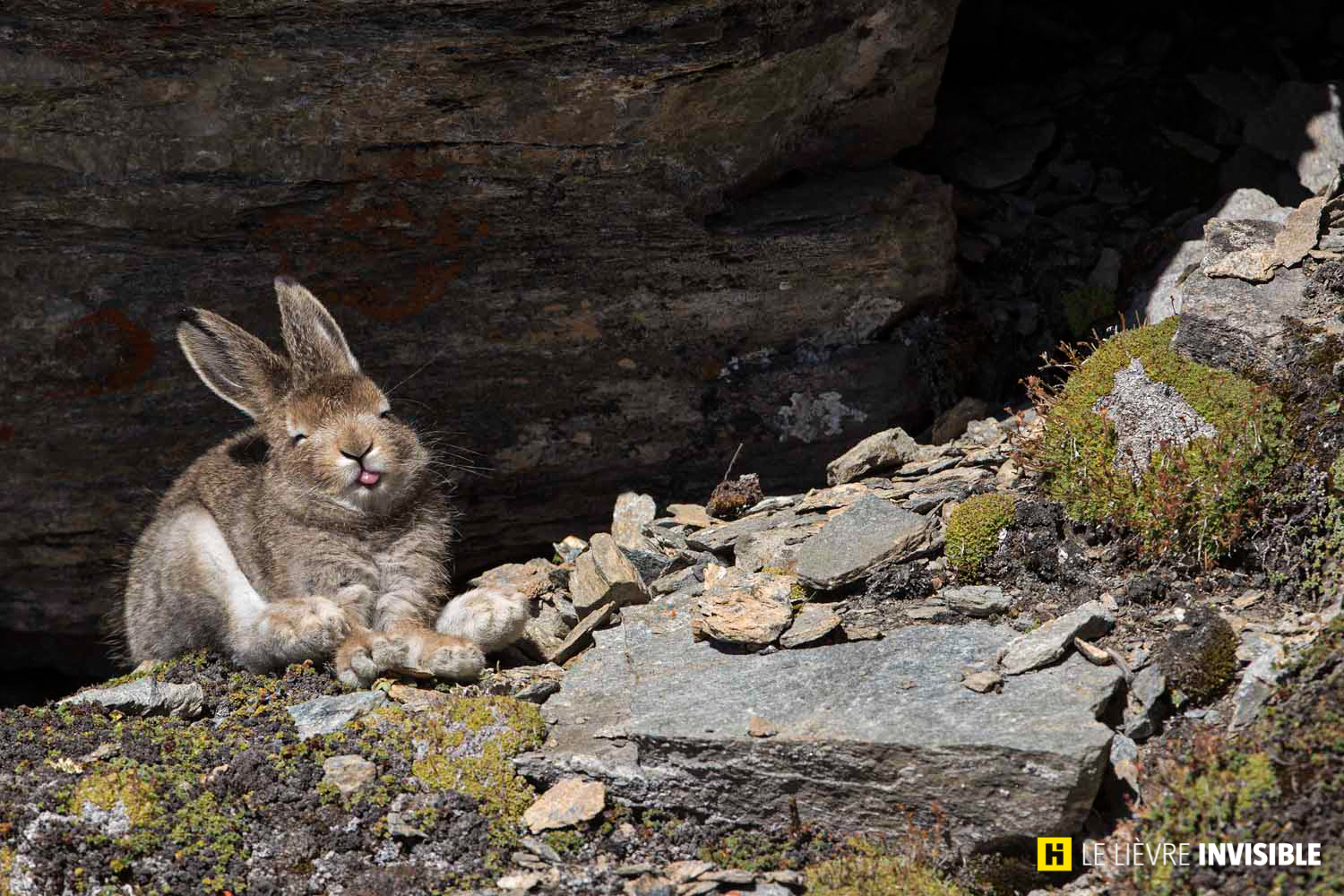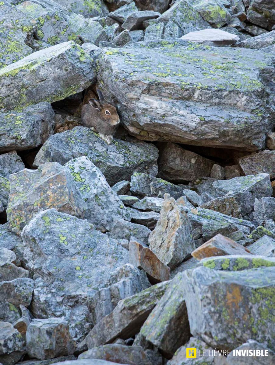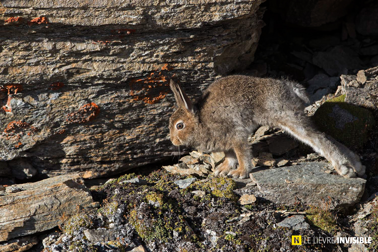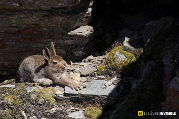 Début Juillet, au milieu d’un éboulis à 2000 m d’altitude. Après 51 jours de gestation, une femelle de lièvre variable vient de mettre bas quatre levrauts. Les nouveaux nés sont couverts de poils gris, les yeux ouverts, et pèsent déjà une centaine de grammes. Ils sont nidifuges, c’est-à-dire qu’ils peuvent se débrouiller seuls, loin du confort d’un nid et de la présence maternelle. En effet, leur mère va rapidement les abandonner après les avoir allaités une première fois. Elle ne reviendra que la nuit suivante pour les nourrir à nouveau. Immobiles, dispersés et parfaitement camouflés entre les pierres, les levrauts sont sans doute plus en sécurité ainsi que groupés près de leur génitrice.
