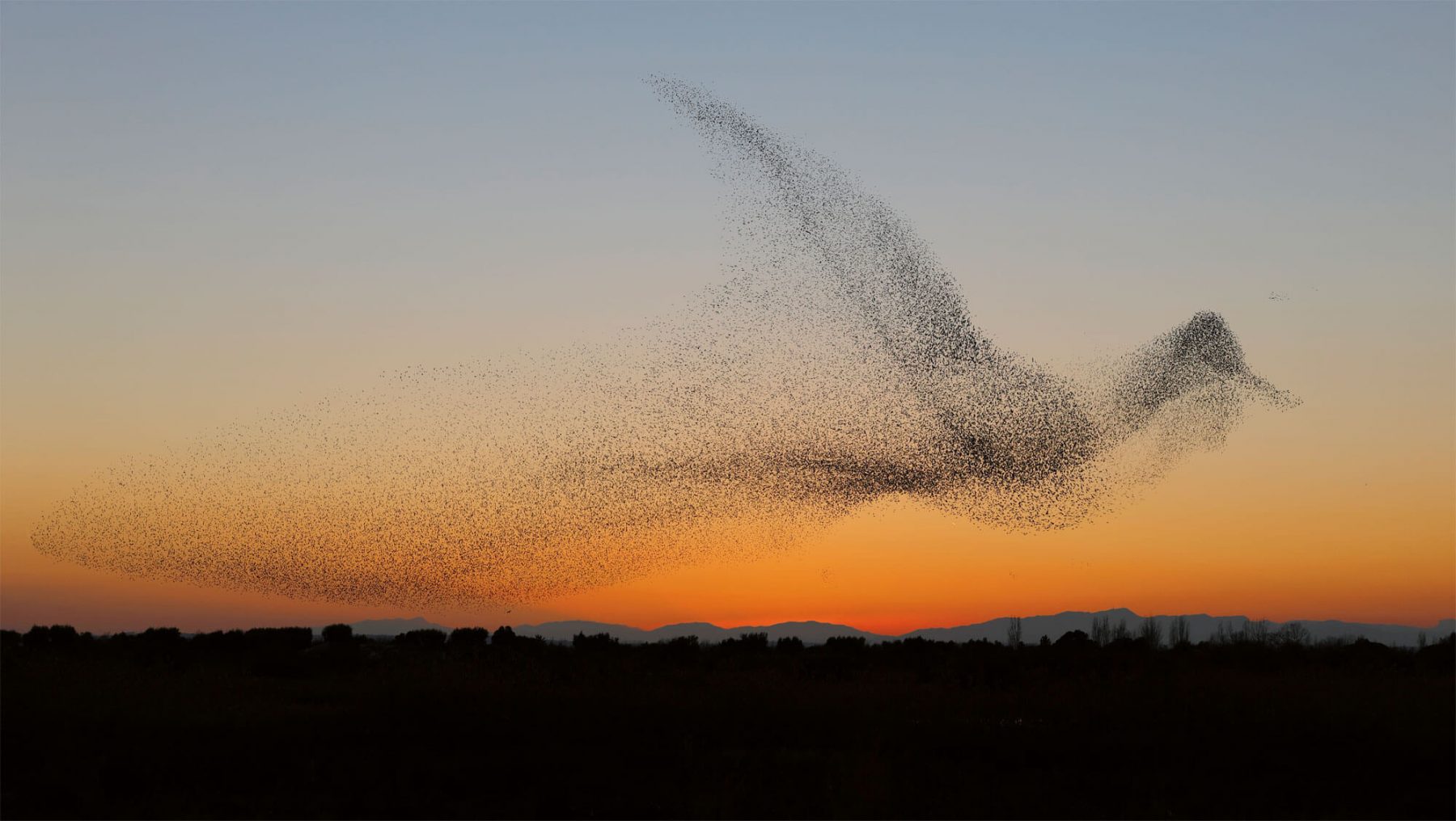 Le photographe allemand Daniel Biber a immortalisé ce moment magique en Espagne. Une image truquée, penserez-vous peut-être ? Pas du tout, à l’heure des détestables fake news, la nature fait de la résistance et sait encore offrir une beauté vraie. Les vols d’étourneaux sansonnets sont de véritables essaims dont la forme varie sans cesse, comme celle des nuages. Fruit du hasard ou de la patience, ces cent mille passereaux ont fini par dessiner ensemble leur propre image, le temps d’un instant.