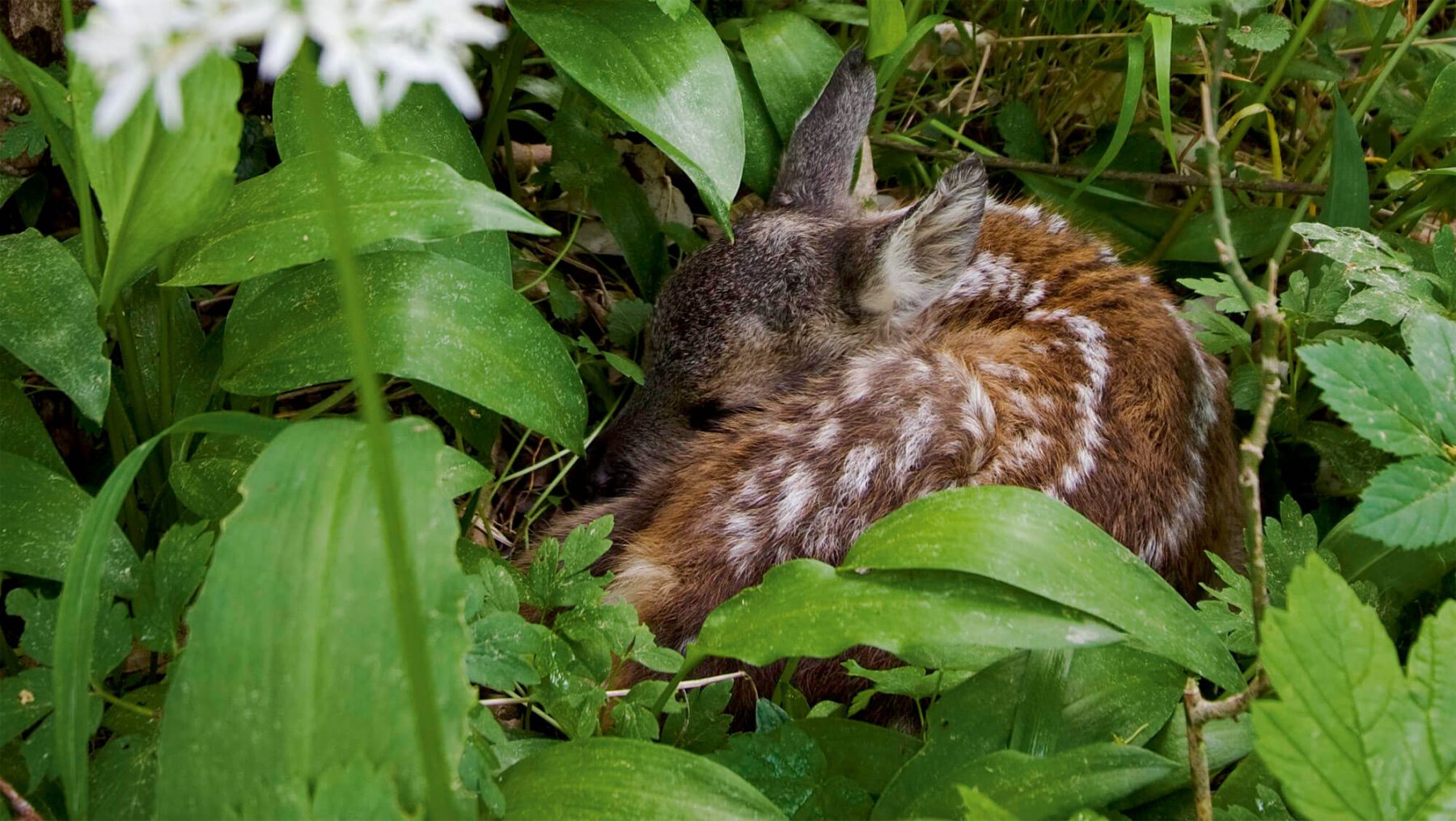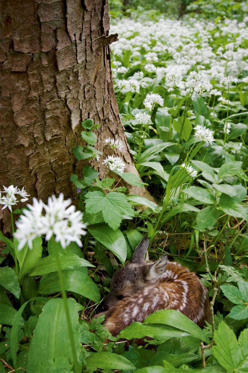 Non loin de là, au milieu des graminées, un bébé chevreuil se tient blotti. La course précipitée de sa mère l’a averti du danger. Plutôt que de tenter une fuite hasardeuse sur des pattes encore frêles, le faon mise sagement sur la discrétion la plus totale. Son pelage de Bambi brun maculé de blanc imite à la perfection les jeux d’ombre et de lumière du soleil entre les feuilles. Une absence presque totale d’odeur lui donne une chance supplémentaire de gagner la partie de cache-cache avec les sangliers, les chiens et autres nez fins. Sa mère lui rend visite discrètement une dizaine de fois par jour. Elle l’approvisionne ainsi avec son lait deux fois plus riche que celui d’une vache et avale ses crottes pour ne laisser aucune trace odorante. C’est dans ce secret absolu que le faon passe les premières semaines de sa vie.