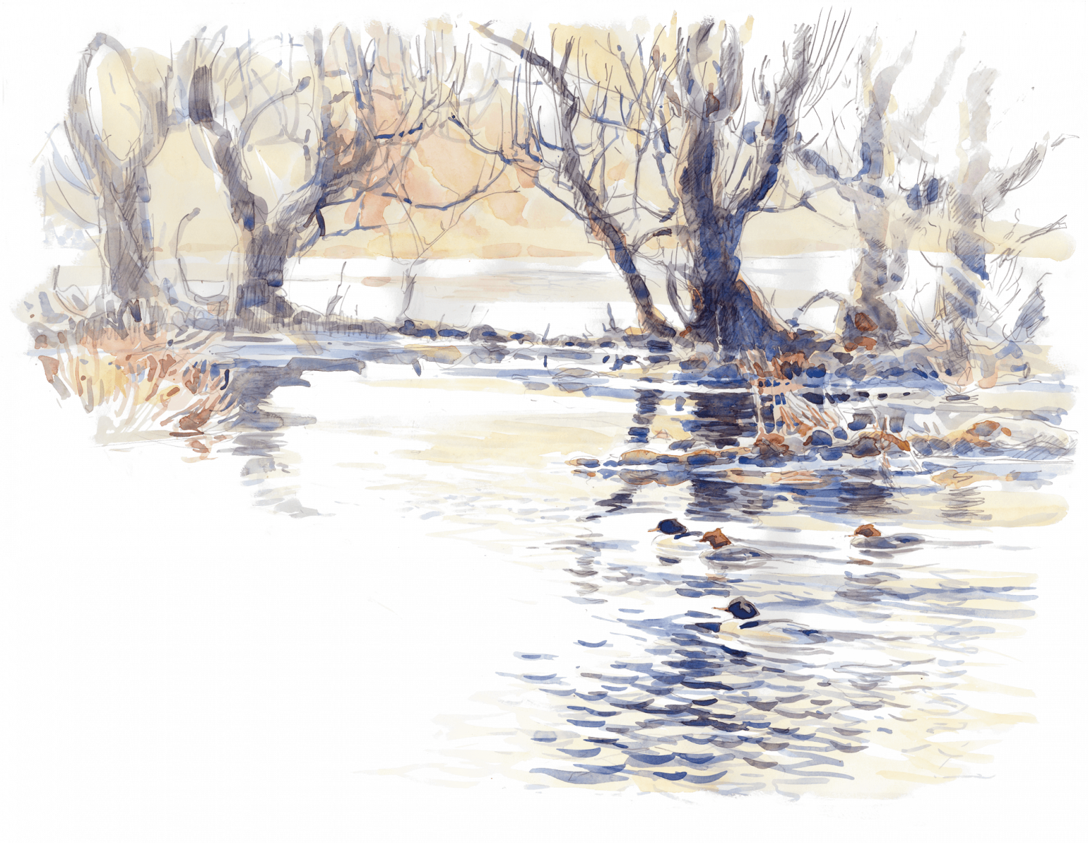 L’entendez-vous ? Elle coule inlassablement, tel un fil d’argent dans la campagne endormie. Mais qui fréquente encore une rivière glaciale en plein hiver ? Pas le baigneur, il s’est rhabillé depuis belle lurette. Ni le rameur, il a rangé son canoë bien au sec. L’ornithologue peut-être ? Non, lui préfère de loin les rivages paisibles d’un lac où les canards se laissent admirer de tout près. Pourtant, le lieu est idéal pour prendre un bain de sauvage. Et rencontrer, pourquoi pas, deux personnages tout droit sortis d’un roman de trappeurs. Le harle, canard plongeur toujours sur son trente-et-un, et le castor, sous-marin à fourrure aux mœurs vespérales.