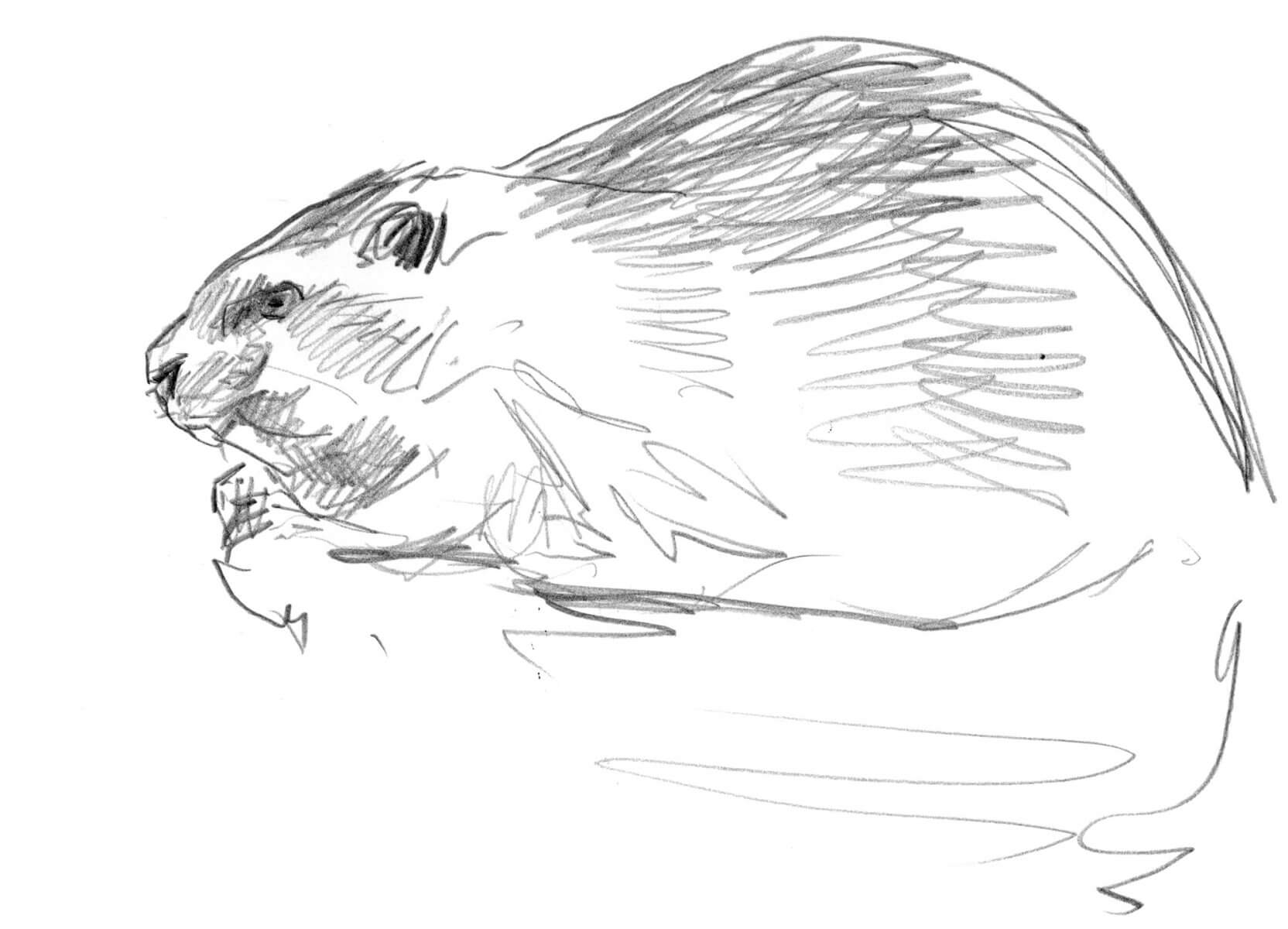 Après cinquante mètres d’une marche délicate parmi la végétation dense malgré la saison, nous arrivons non loin de la hutte bâtie à l’abri des regards. A proximité de cette cabane en branches, on distingue un passage. A force de grimper par là, les castors ont mis la terre à nu. Aux alentours abondent des troncs et des branches fraîchement rongés. C’est l’endroit idéal pour espérer surprendre le bûcheron avant la nuit. Il ne reste plus qu’à attendre son arrivée confortablement camouflés derrière une vieille souche de peuplier. En quelques minutes, les yeux s’habituent au manque de lumière et aux couleurs qui s’estompent. La nature propose bien des curiosités pour combler l’attente. Il suffit de prendre le temps d’observer les alentours. Sur le sol, des empreintes piétinent le sable humide juste à nos pieds. Plus loin le ballet des mésanges boréales anime le couchant pendant que ricane un grèbe castagneux. Une silhouette sombre nage dans notre direction. Fausse alerte ! Un museau blanchâtre et une queue cylindrique trahissent un ragondin. Déception passagère : il faut s’attendre à cette farce du rongeur sud-américain localement très abondant.