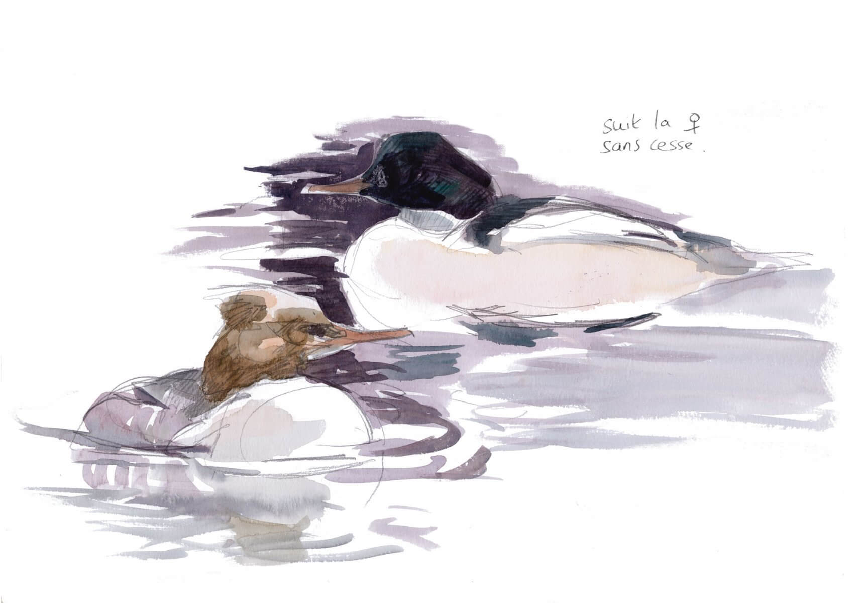 Passé un méandre, ils sont là, réunis comme une assemblée secrète dans la brume. Des harles bièvres en pleine parade nuptiale ! Trois mâles imposants arborent leur plumage de prestige : un costume noir et blanc teinté de rose sur la poitrine, avec un couvre-chef sombre aux reflets verts. Un bec rouge sang souligne leur sourire malicieux. Les courtisans s’agitent au milieu d’une cour de huit femelles grises coiffées de brun roux. Ils s’ébrouent avec excitation, lèvent le bec au ciel puis le plongent à moitié en tenant la tête oblique.