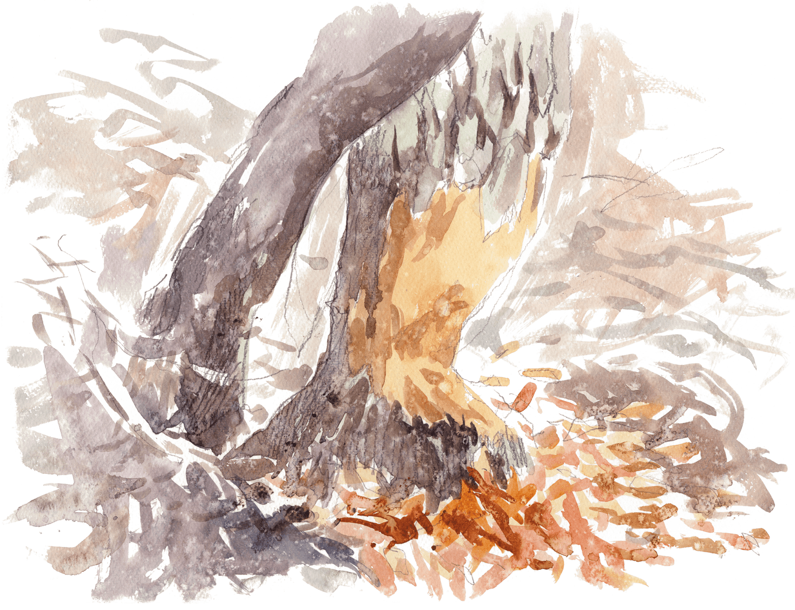 Le ciel rosit à l’ouest. Abandonnons les harles à leurs amours pour continuer de louvoyer entre les arbres et la berge. Devant nous se dresse un saule vénérable, totalement dévoré à la base. Le message est clair...