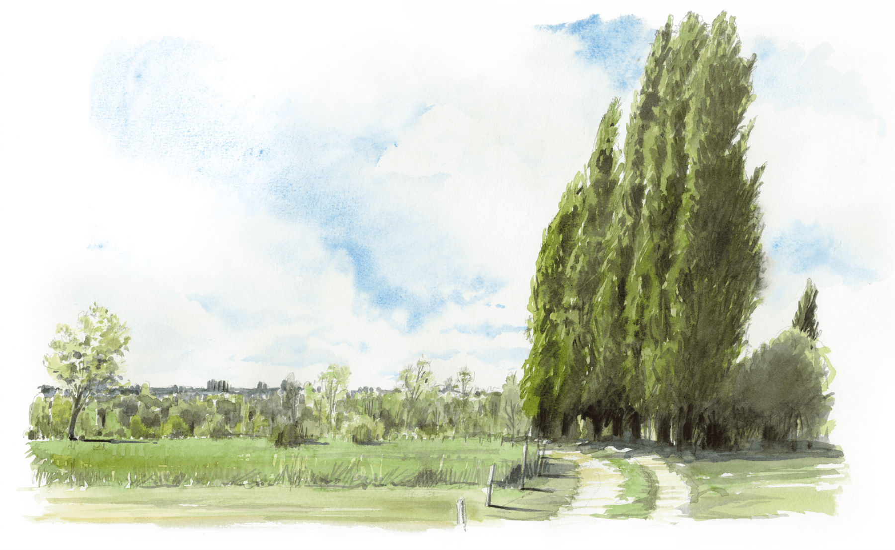 Après une matinée limpide, le vent se renforce peu à peu et devient tempétueux. Sombres et menaçants, de gros nuages gonflent dans l'azur. L'orage est imminent… Ambassadrices des éclairs et du tonnerre qui vont se déchaîner, des rafales violentes plient dangereusement l'alignée de grands peupliers noirs le long du chemin de terre battue. Plusieurs branches cassent d'un bruit sec.