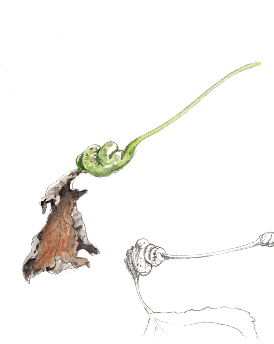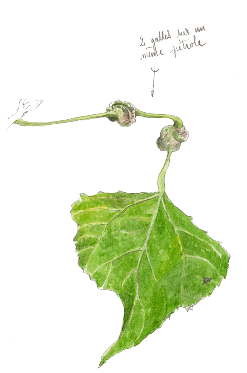 Après un bref vol, brindilles et feuilles tombent au sol. En les observant avec attention, vous remarquerez des sortes de renflements spiralés sur le pétiole des feuilles. Maladie ? Champignon ? Ce sont des galles provoquées par des pucerons. Sortez votre loupe pour un voyage extraordinaire au royaume de Pemphigus spyrothecae, un insecte minuscule au cycle de vie extraordinaire.