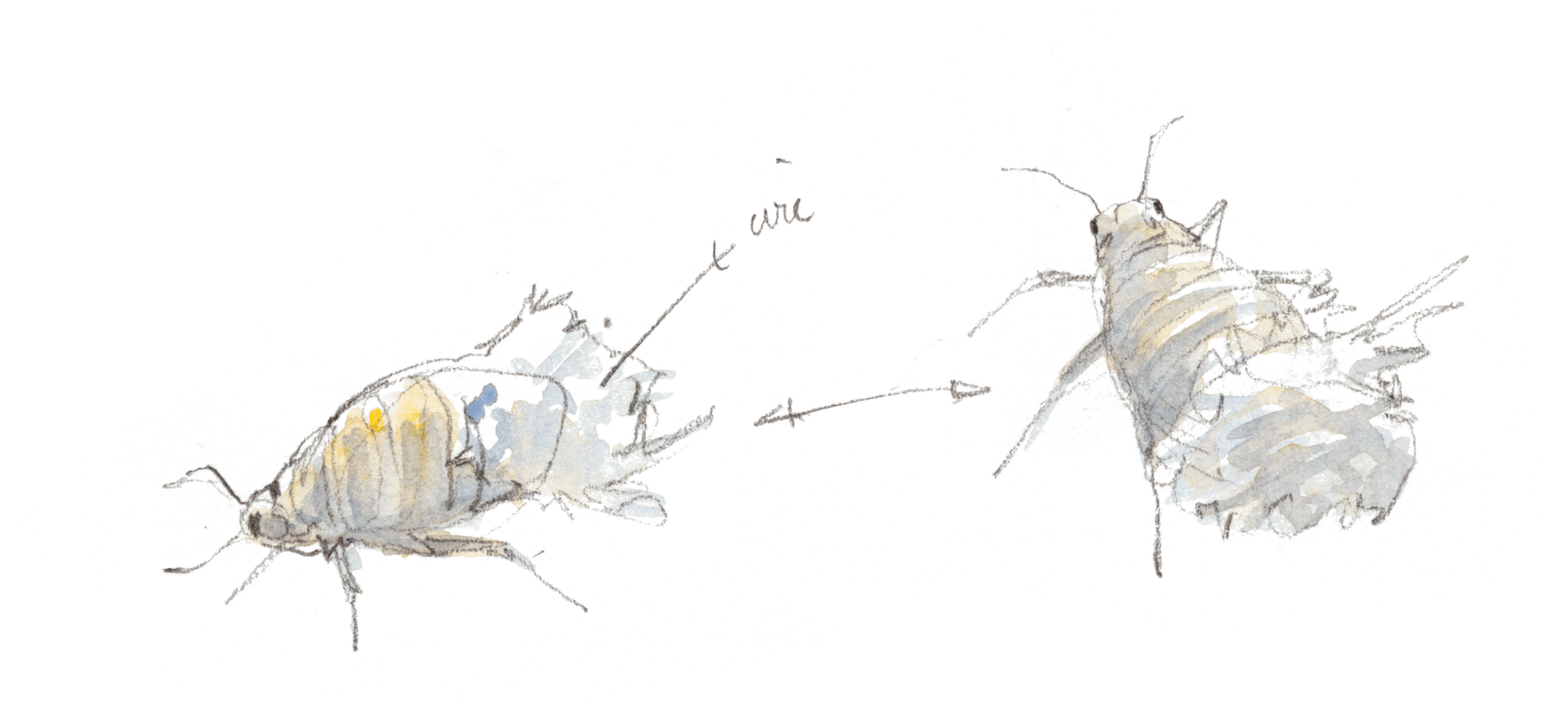 Lorsque les couleurs d'automne embellissent les peupliers, les pucerons s'accouplent enfin. Puis, les femelles pondent un œuf… unique ! Logé dans une crevasse de l'écorce, ce dernier est capable de résister à des froids sibériens. Aux beaux jours d'avril, il en sortira une nouvelle fondatrice qui donnera naissance à un autre petit royaume spiralé.