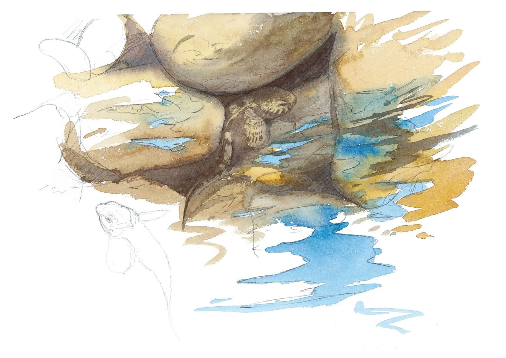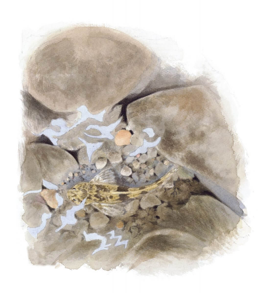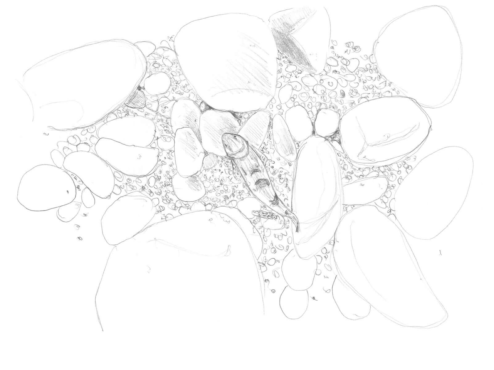 Un jour, pour mieux détailler sa tête proéminente et ses grandes nageoires pectorales, nous avons délicatement retiré un mâle de son abri pour le déposer dans un bac en plastique blanc. Extraordinaire métamorphose ! En réaction à ce nouvel environnement immaculé, le poisson a viré en quelques dizaines de secondes d’une teinte presque noire à un beige très clair. Poisson caméléon, poisson caillou littéralement vissé à son coin de rivière, le chabot nous a paru de plus en plus attachant au fil des semaines. Ce n’est pas un hasard si, parmi les innombrables sujets offerts par la rivière, c’est le seul choisi et dessiné par nos trois artistes. Jolie convergence sur un animal qui symbolise si pleinement l’esprit des galets.