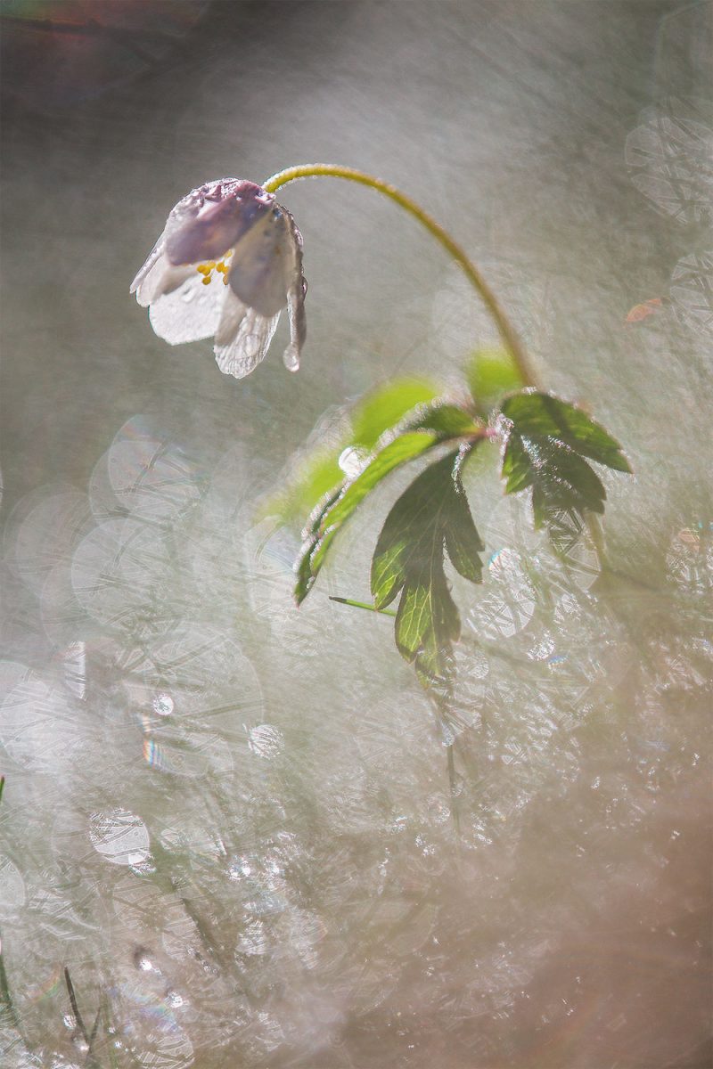 Curieuse impression d’être à la maison, alors que tout pourrait me paraître inhospitalier. Je passe la moitié de la nuit à me faire toute petite, à écouter les bruits des arbres, les oiseaux nocturnes parfois lointains, parfois tout proches, à surprendre une araignée funambule en chasse. La notion du temps n’est plus la même. Mon seul repère est l’inclinaison de la lune et sa lumière changeante sur les feuillages des arbres. Mes yeux habitués au noir sont captivés par les perce-neige qui tapissent ce lieu magique et reflètent la plus infime trace de lumière. J’ai l’impression d’être dans une forêt de lanternes magiques, s’agitant dans la brise comme pour signaler le début du printemps. Je me consacre à l’une d’entre elles. L’image se dessine toute seule, simplement, comme dans un rêve éveillé.