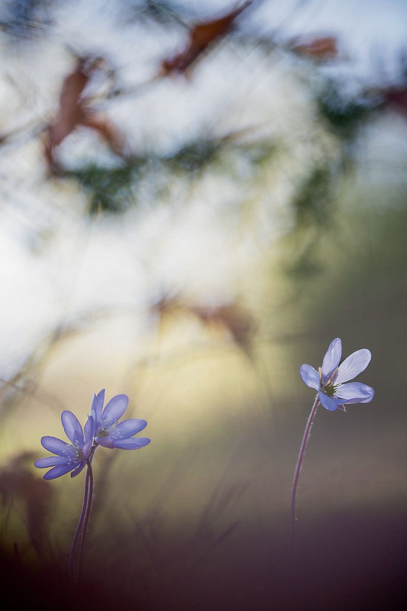 Le couchant sublime la lumière. Difficile de partir en fin de journée. Cette fois, malgré le froid et le vent qui hurle entre les arbres, je décide de rester. Alors que le soleil se couche, je découvre une petite clairière, abritée par un cercle de rochers de plus de 2 m de hauteur, dans laquelle il faut descendre par un passage étroit. Autour, ce n’est que mousses, feuilles mortes, perce-neige et hépatiques à trois lobes. L’autel du printemps.