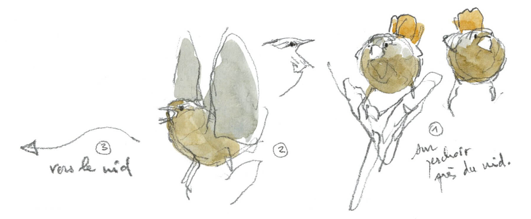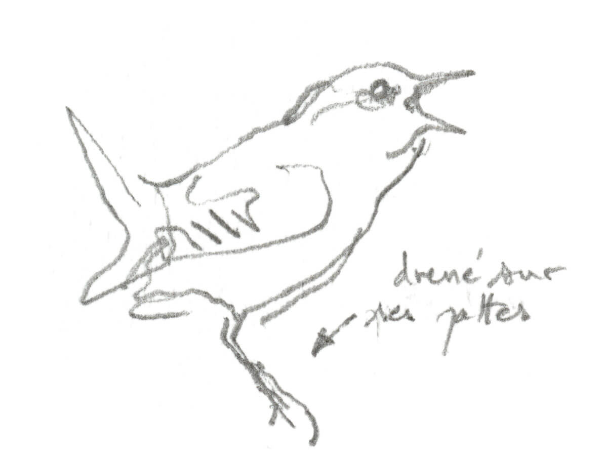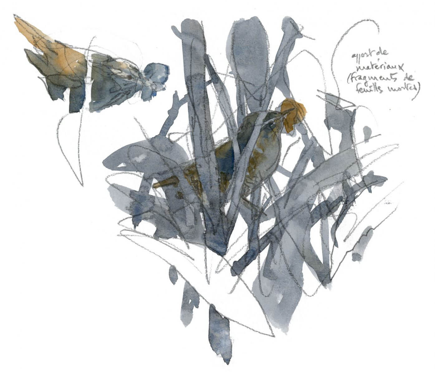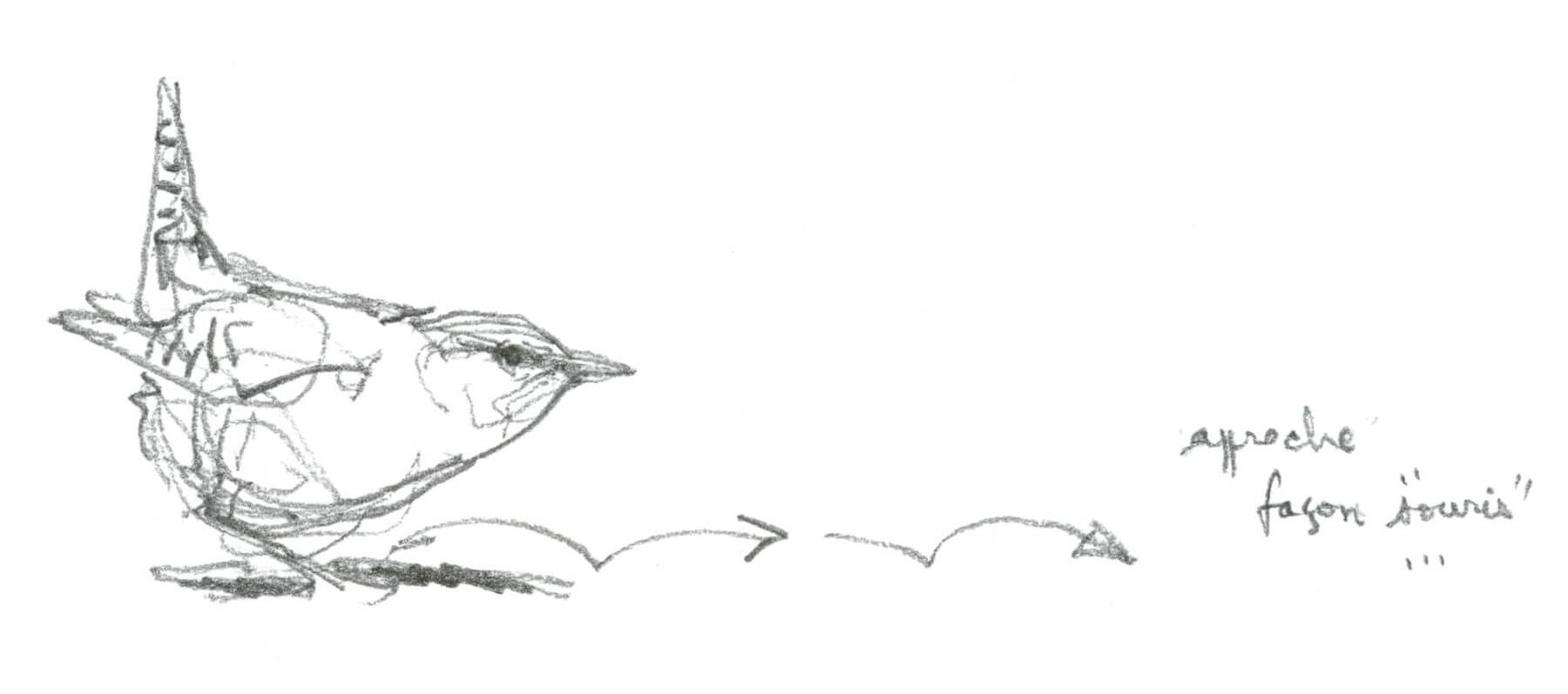 L’entretien de son plumage terminé, le troglodyte adopte une posture dressée, rectrices à 45° et poitrine gonflée. Il entonne alors de longues strophes d’une ampleur à faire pâlir un rossignol. C’est un mâle. Qui aurait cru que ces notes claires naissent dans la gorge d’un si petit oiseau ? Après avoir fait le tour de ses six perchoirs habituels et lancé ses phrases dans tous les coins broussailleux de son territoire, le voilà qui repart fouiller le taillis. Il en ressort le bec rempli de feuilles de saule. En voletant en zigzag, il rejoint prudemment une souche tordue pour compléter son œuvre : un nid douillet.