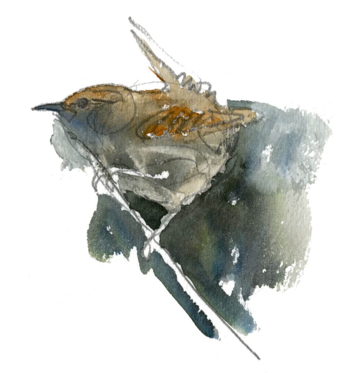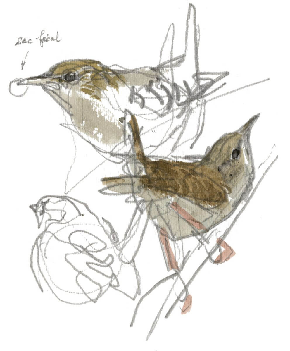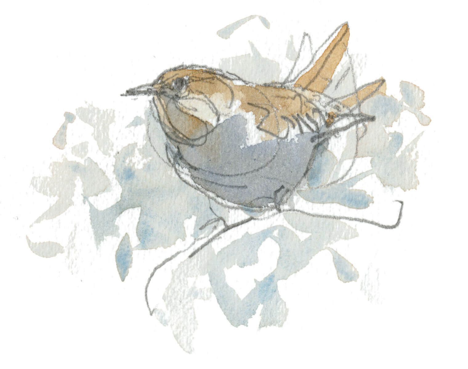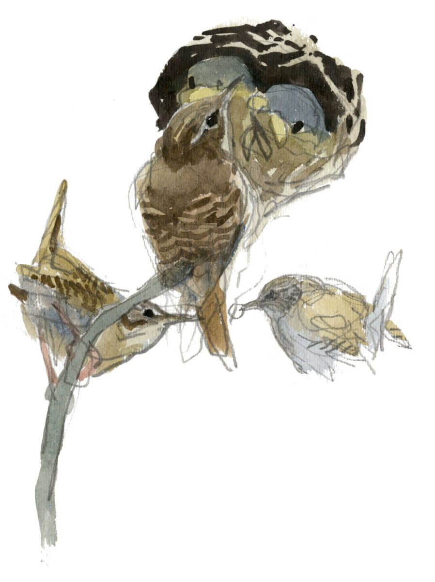 L’entretien de son plumage terminé, le troglodyte adopte une posture dressée, rectrices à 45° et poitrine gonflée. Il entonne alors de longues strophes d’une ampleur à faire pâlir un rossignol. C’est un mâle. Qui aurait cru que ces notes claires naissent dans la gorge d’un si petit oiseau ? Après avoir fait le tour de ses six perchoirs habituels et lancé ses phrases dans tous les coins broussailleux de son territoire, le voilà qui repart fouiller le taillis. Il en ressort le bec rempli de feuilles de saule. En voletant en zigzag, il rejoint prudemment une souche tordue pour compléter son œuvre : un nid douillet.