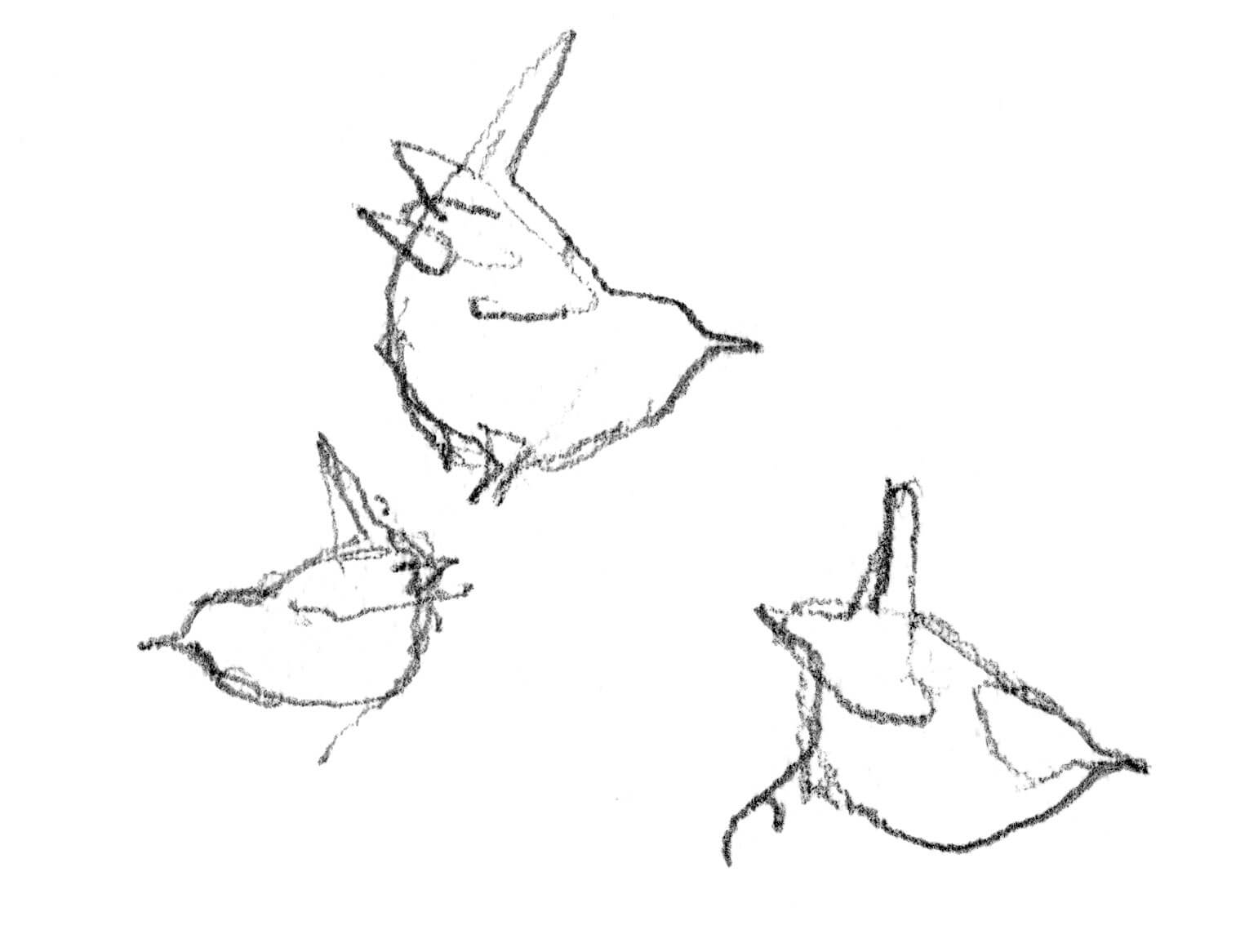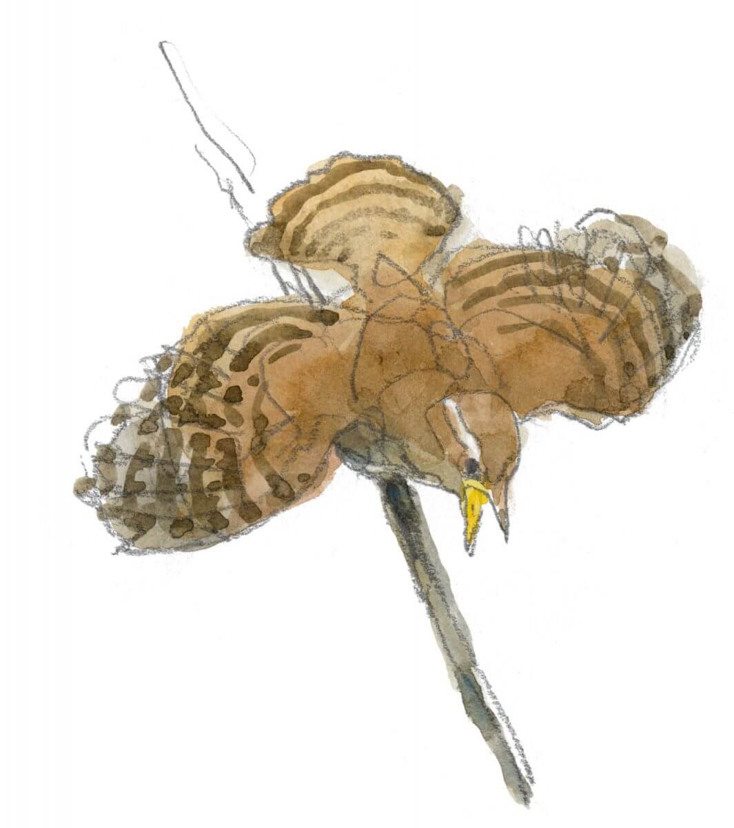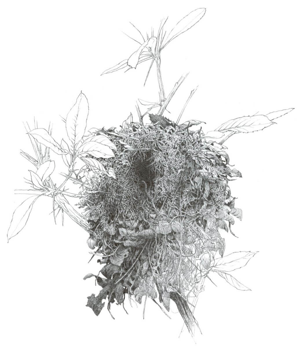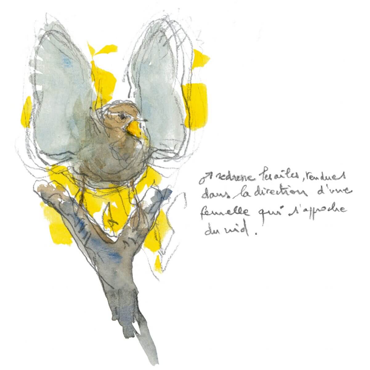 L’entretien de son plumage terminé, le troglodyte adopte une posture dressée, rectrices à 45° et poitrine gonflée. Il entonne alors de longues strophes d’une ampleur à faire pâlir un rossignol. C’est un mâle. Qui aurait cru que ces notes claires naissent dans la gorge d’un si petit oiseau ? Après avoir fait le tour de ses six perchoirs habituels et lancé ses phrases dans tous les coins broussailleux de son territoire, le voilà qui repart fouiller le taillis. Il en ressort le bec rempli de feuilles de saule. En voletant en zigzag, il rejoint prudemment une souche tordue pour compléter son œuvre : un nid douillet.